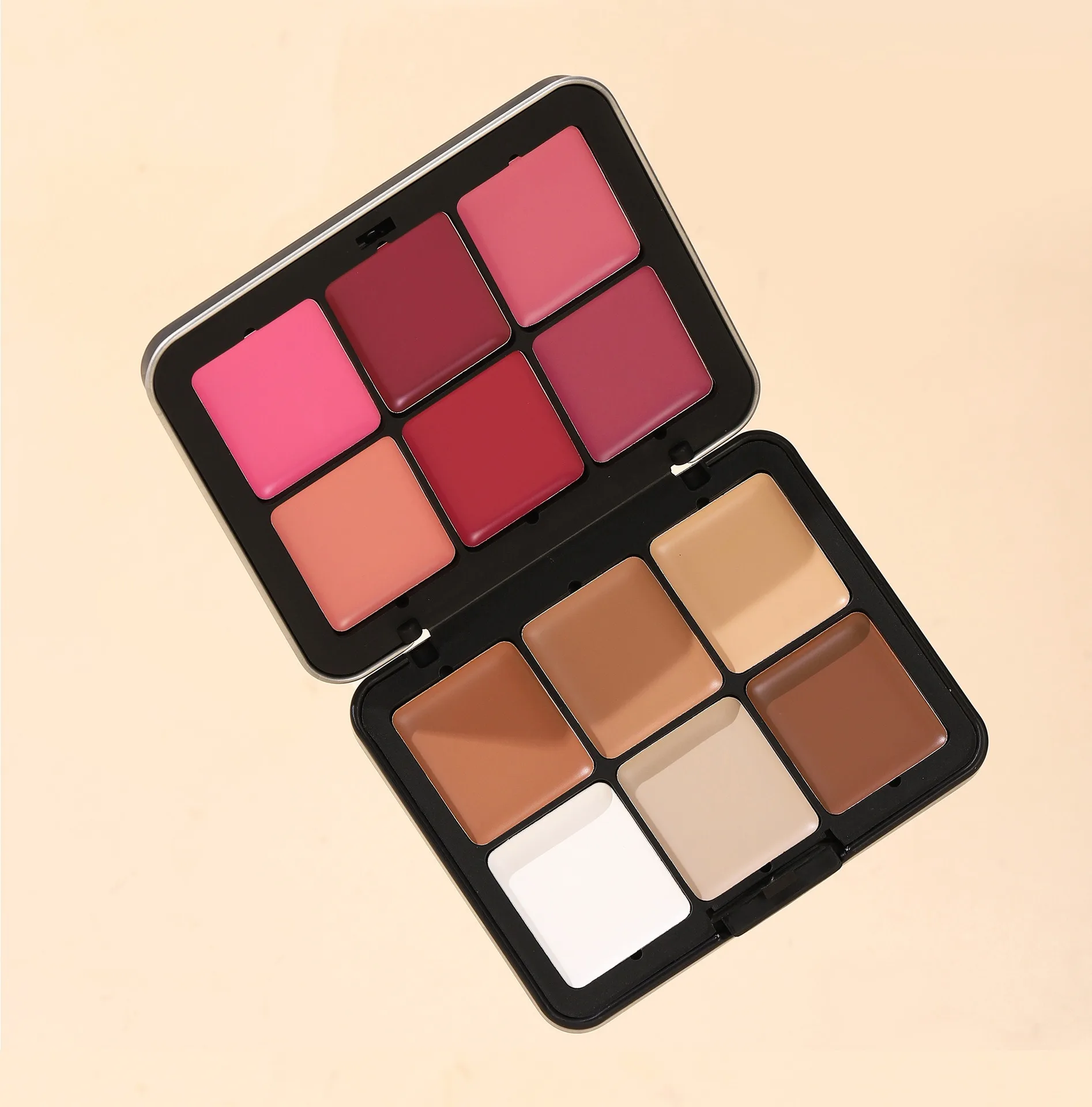 This 2-in-1 palette combines concealer, highlighter, contour, blush, and rouge for a complete makeup look.