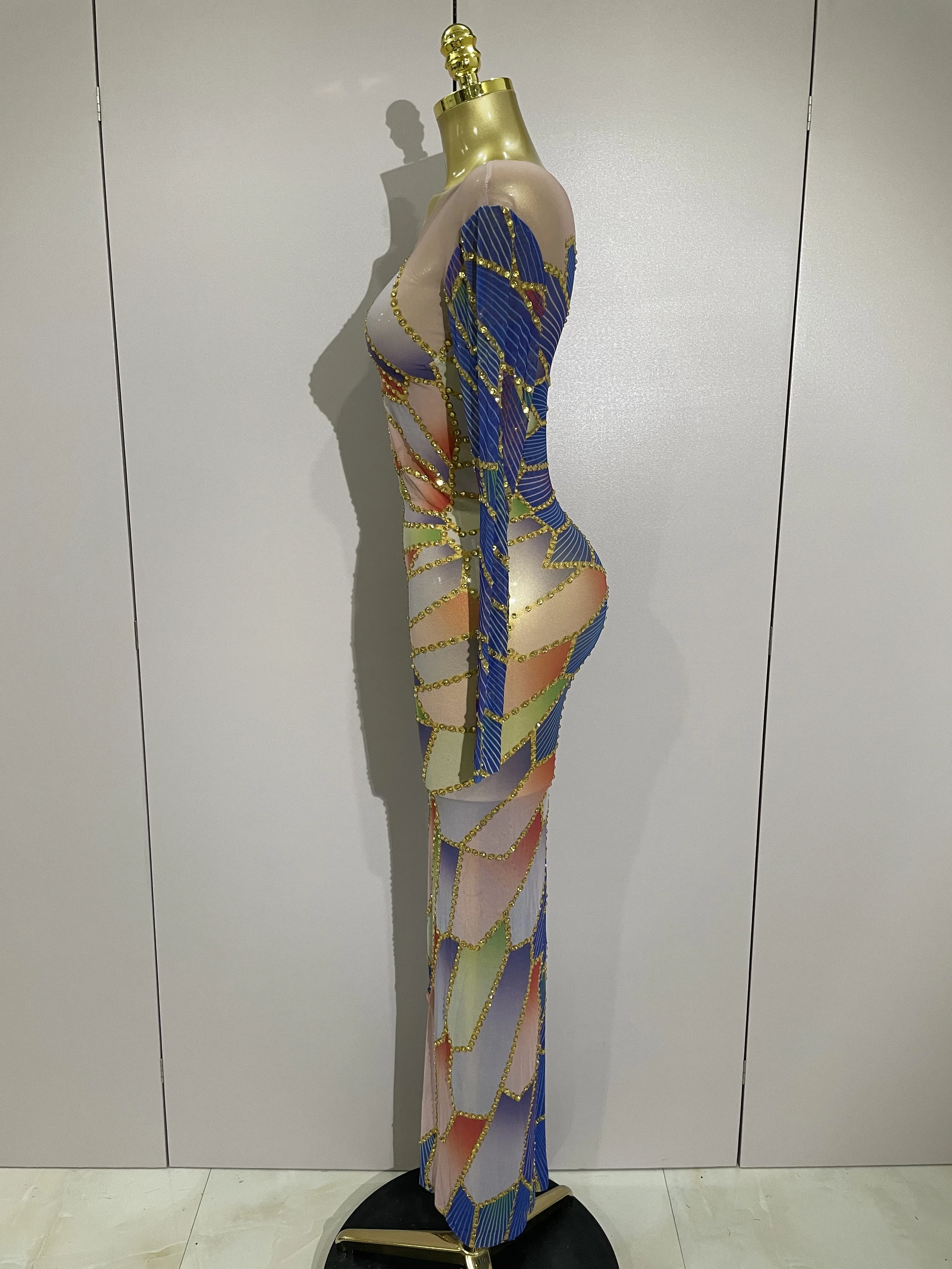 2025 New Luxury Sparkly Rhinestone Stretchy Mesh See Through Long Dress Women Bi