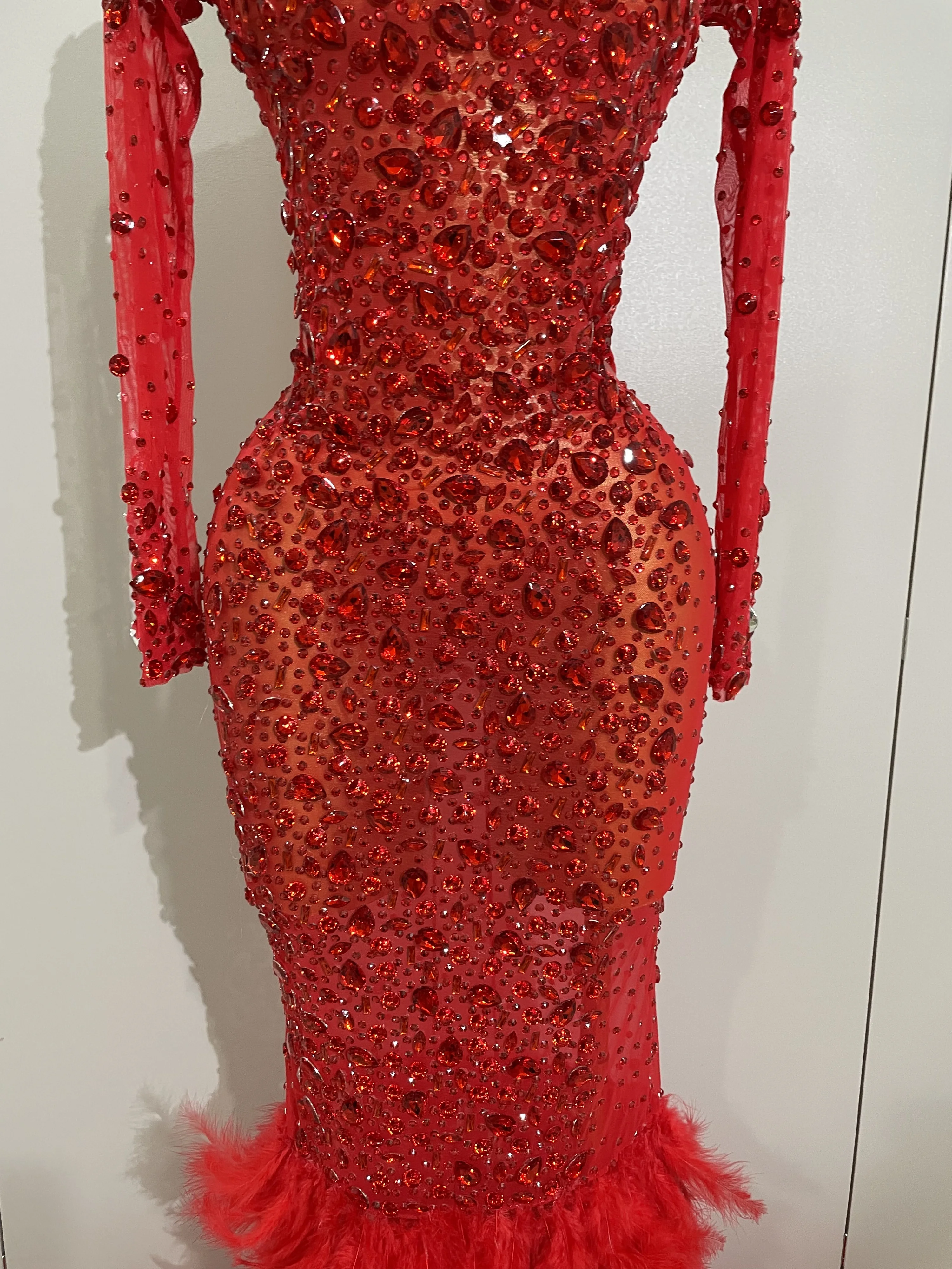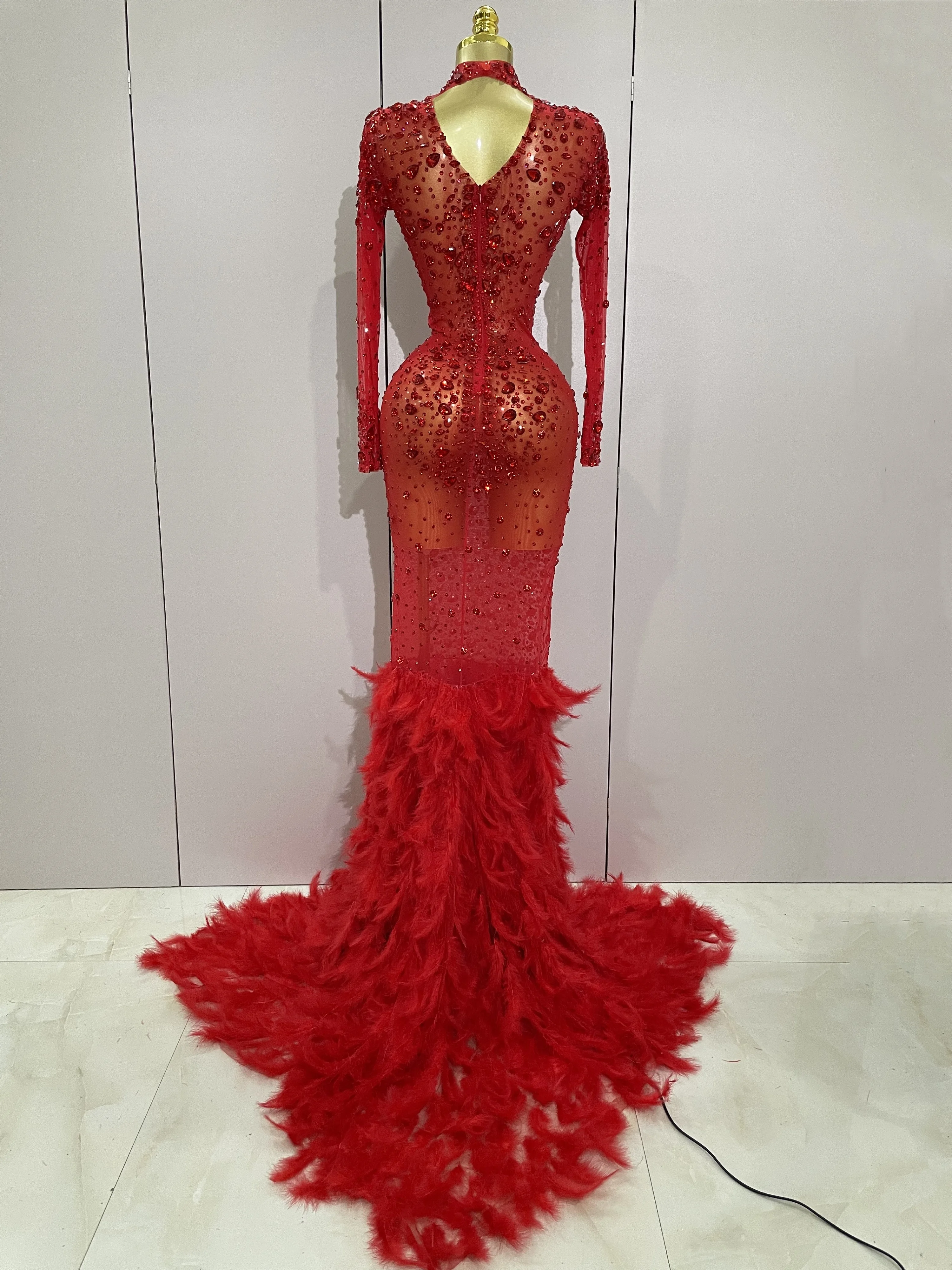2025 New Sparkling Red Crystals Feathers Long Sleeve Mermaid Maxi Dress Women We