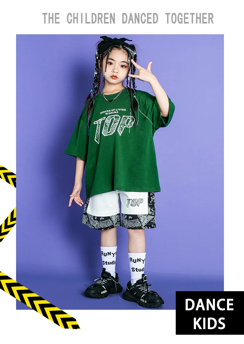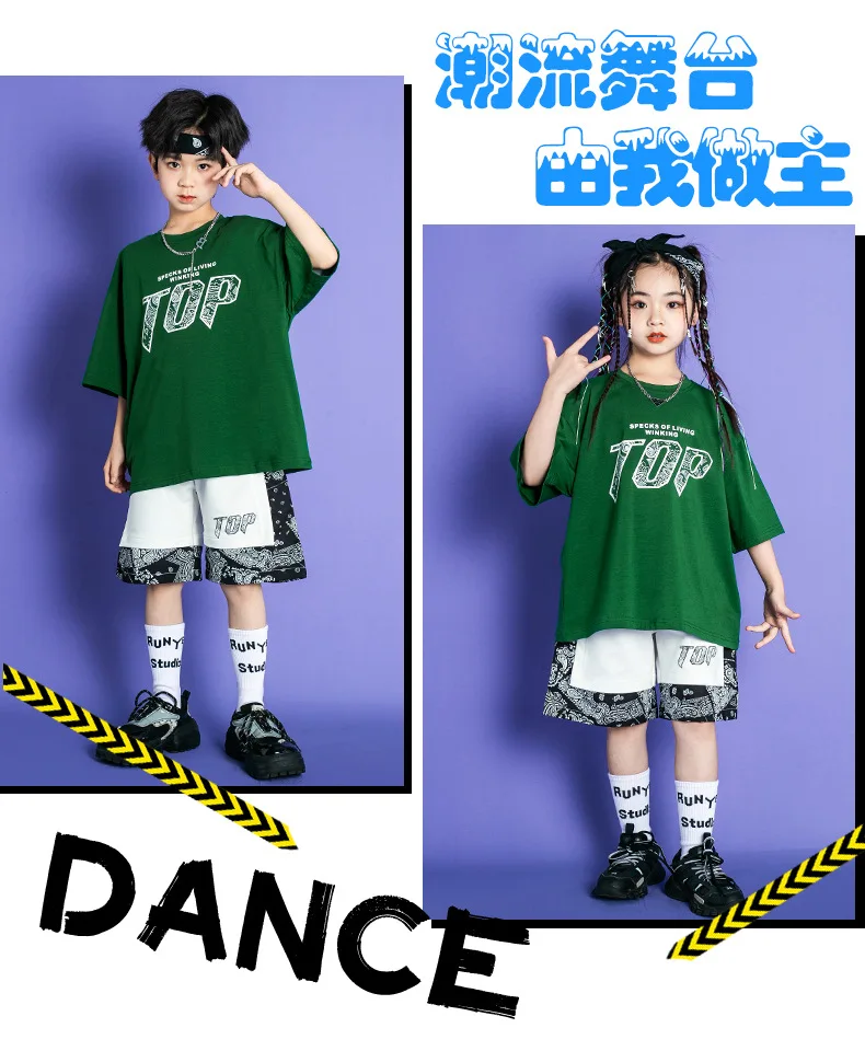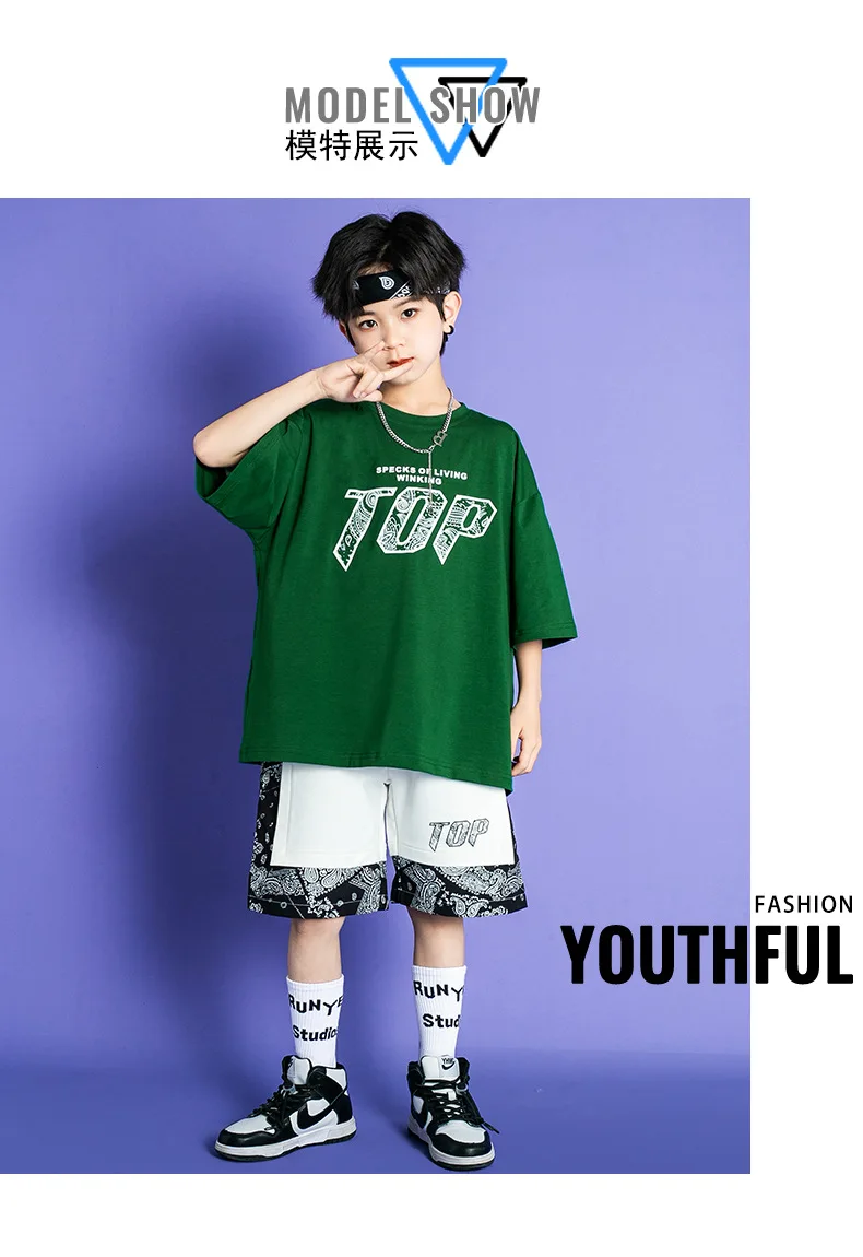 Boys Hip Hop Clothing Green T-shirt Printed Shorts Stage Street Dance Role Play