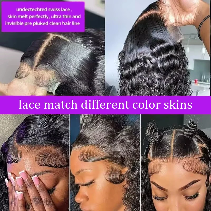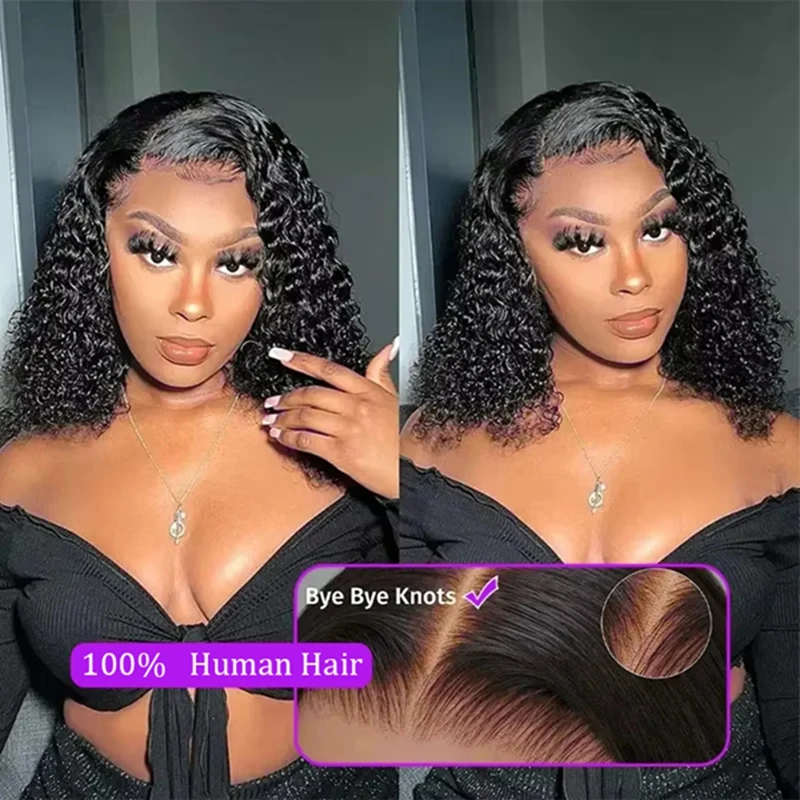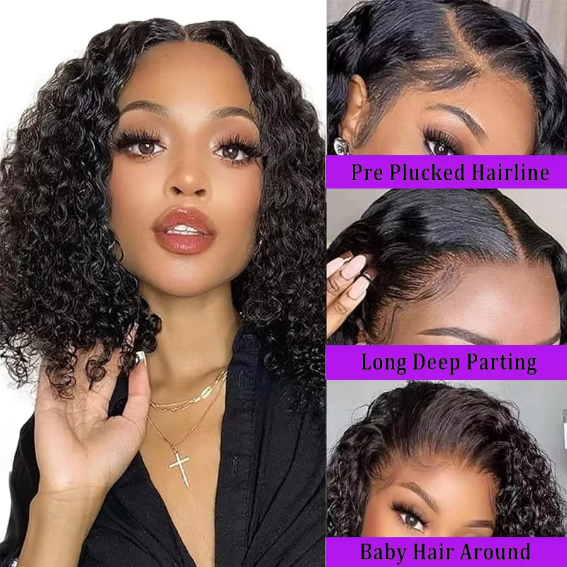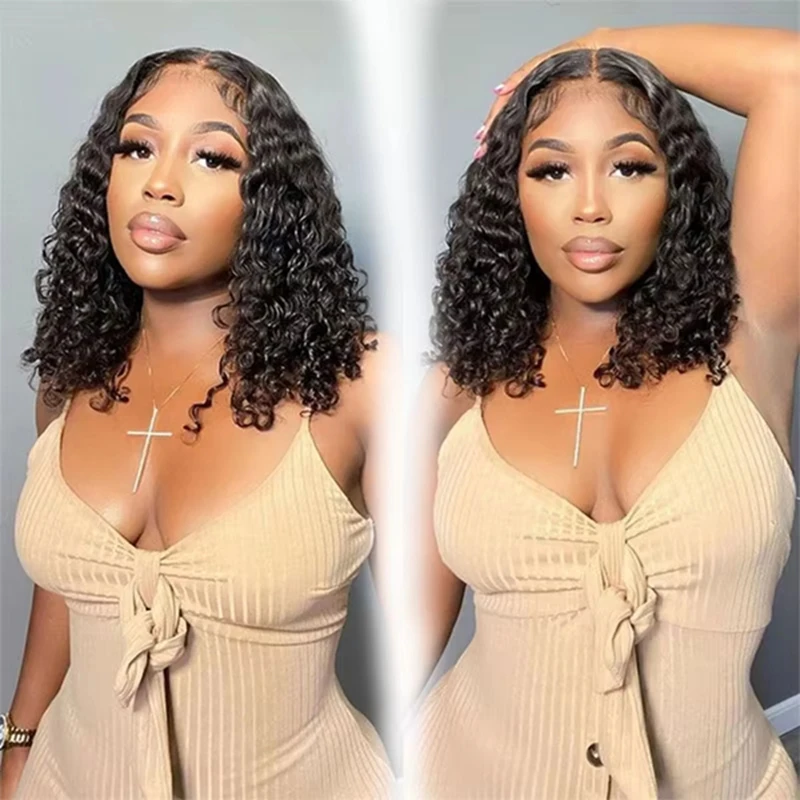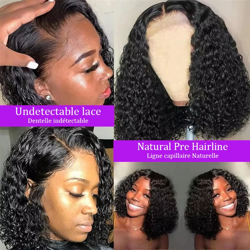 Deep Wave 13x4 Lace Frontal Bob Wig 200% Density Brazilian Pre Plucked 100% Human Hair Wigs #1B Water Wave Invisible Lace Wigs