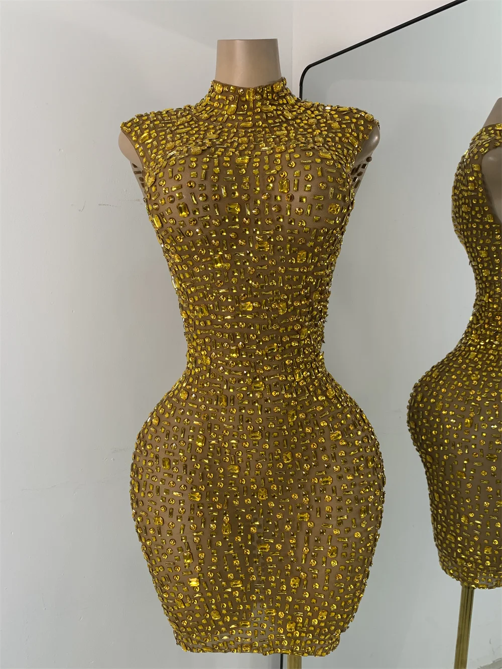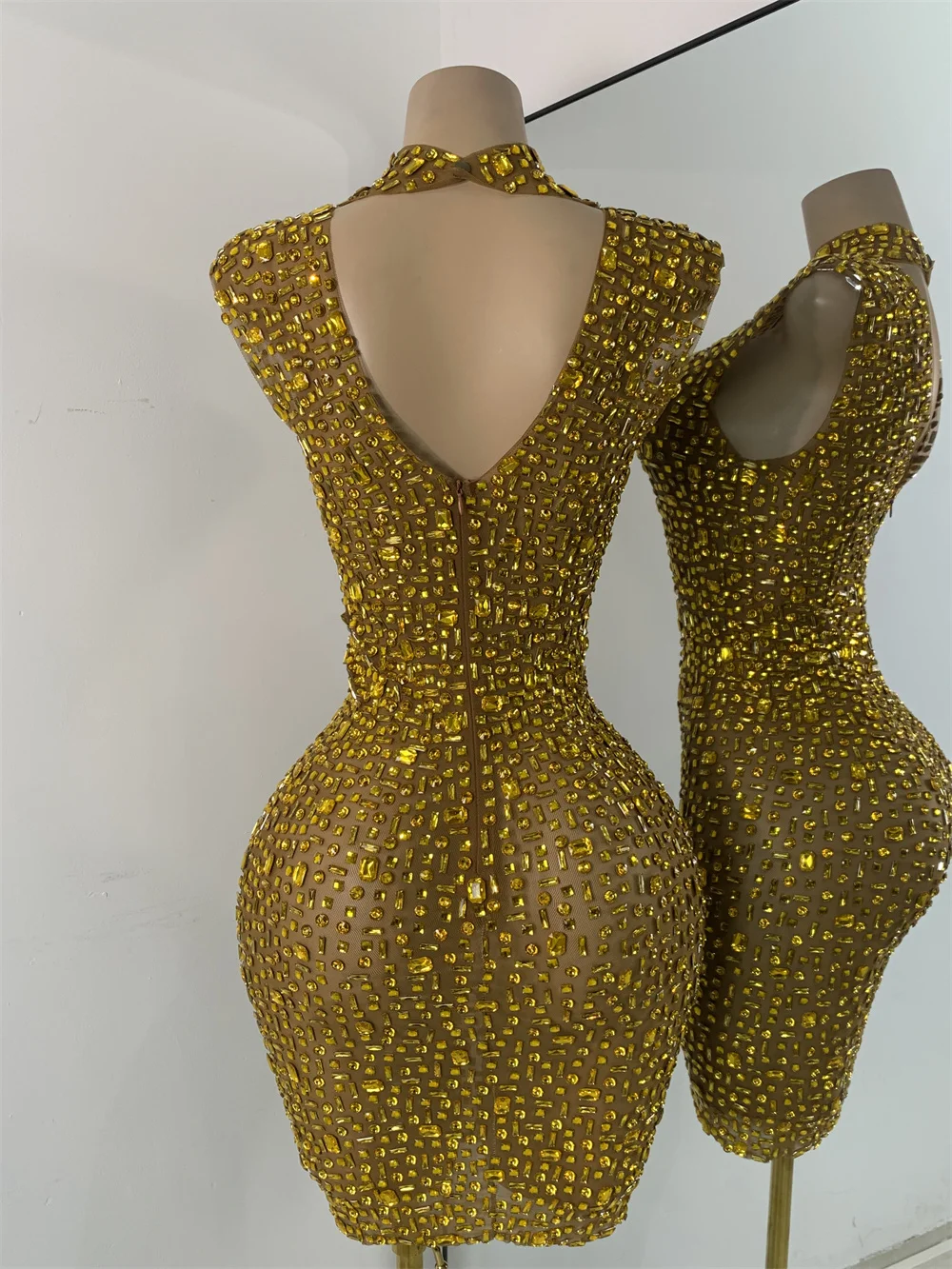 Gold Party Evening Short Dress Sparkly Diamonds Luxury Elegant Mesh See Throught