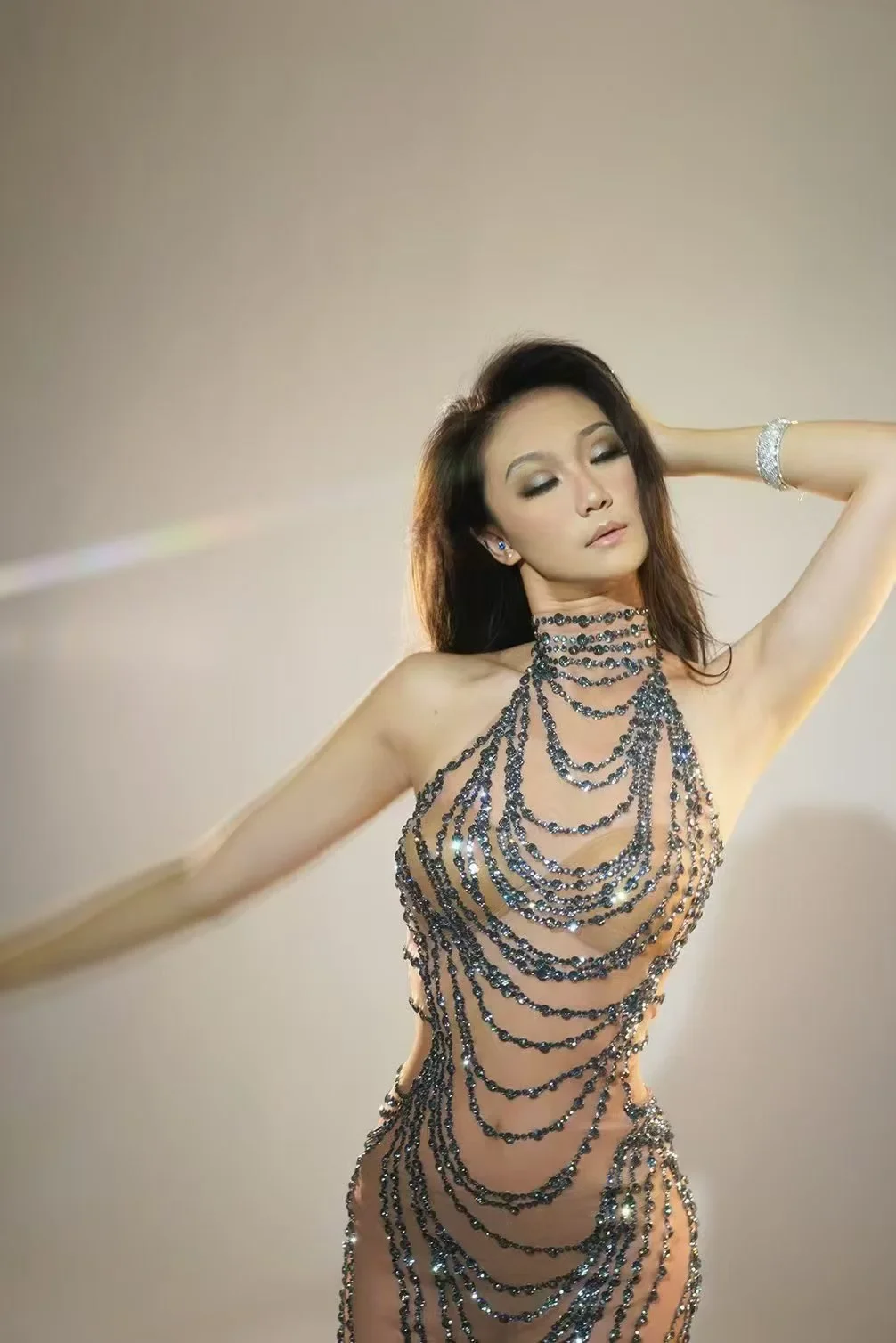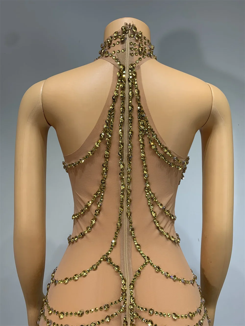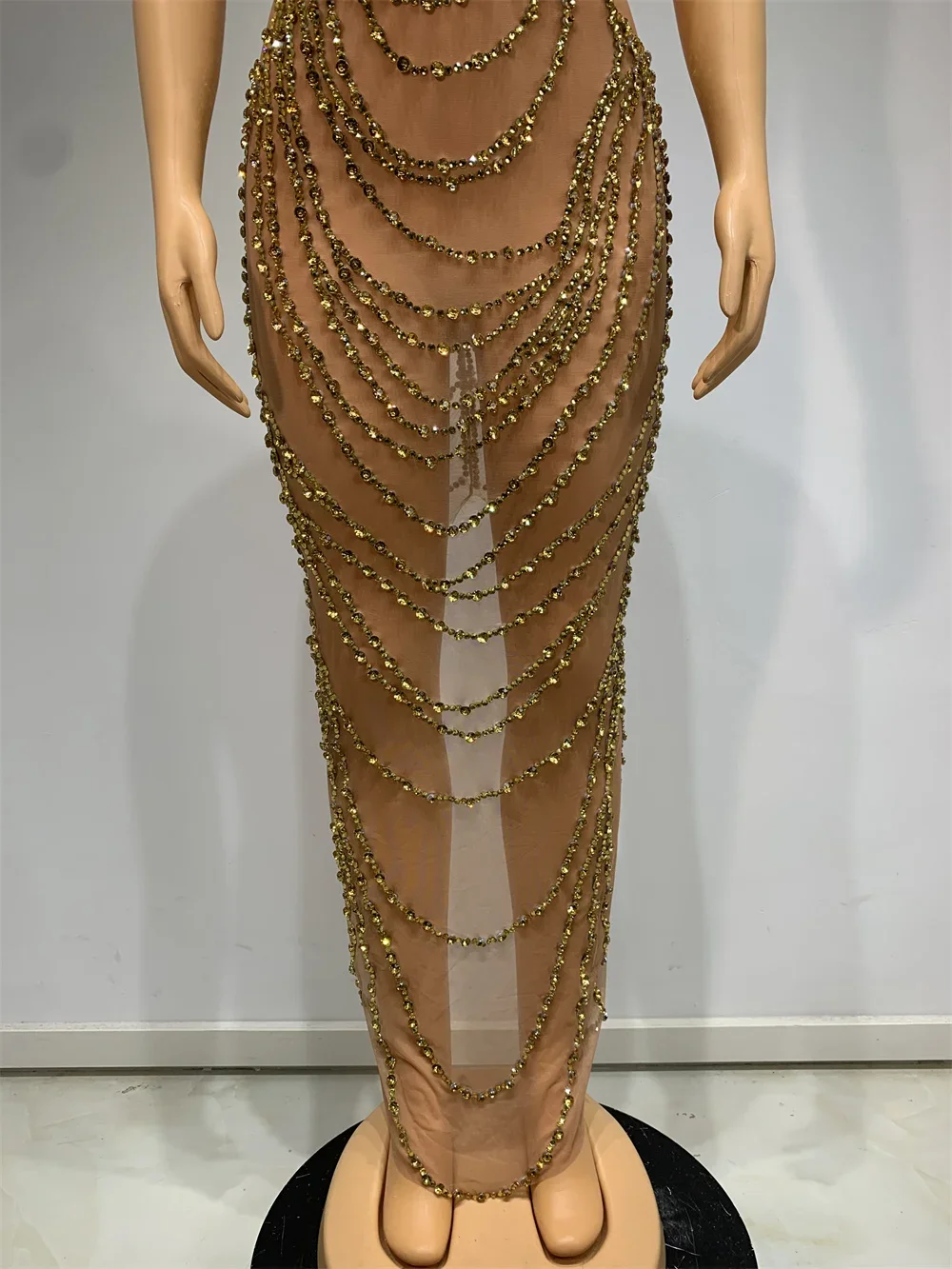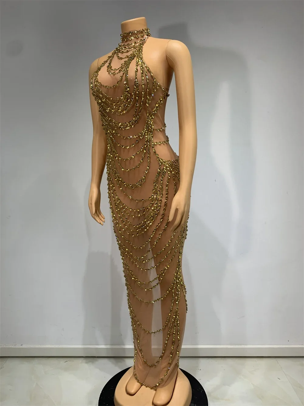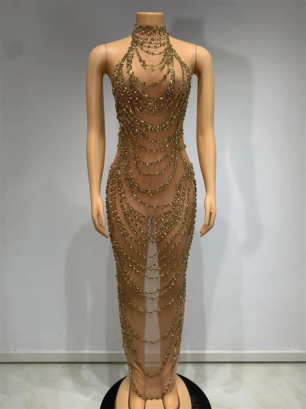 Gold Rhinestones Mesh See Through Long Dress Luxury Women Sexy Silver Evening Pr