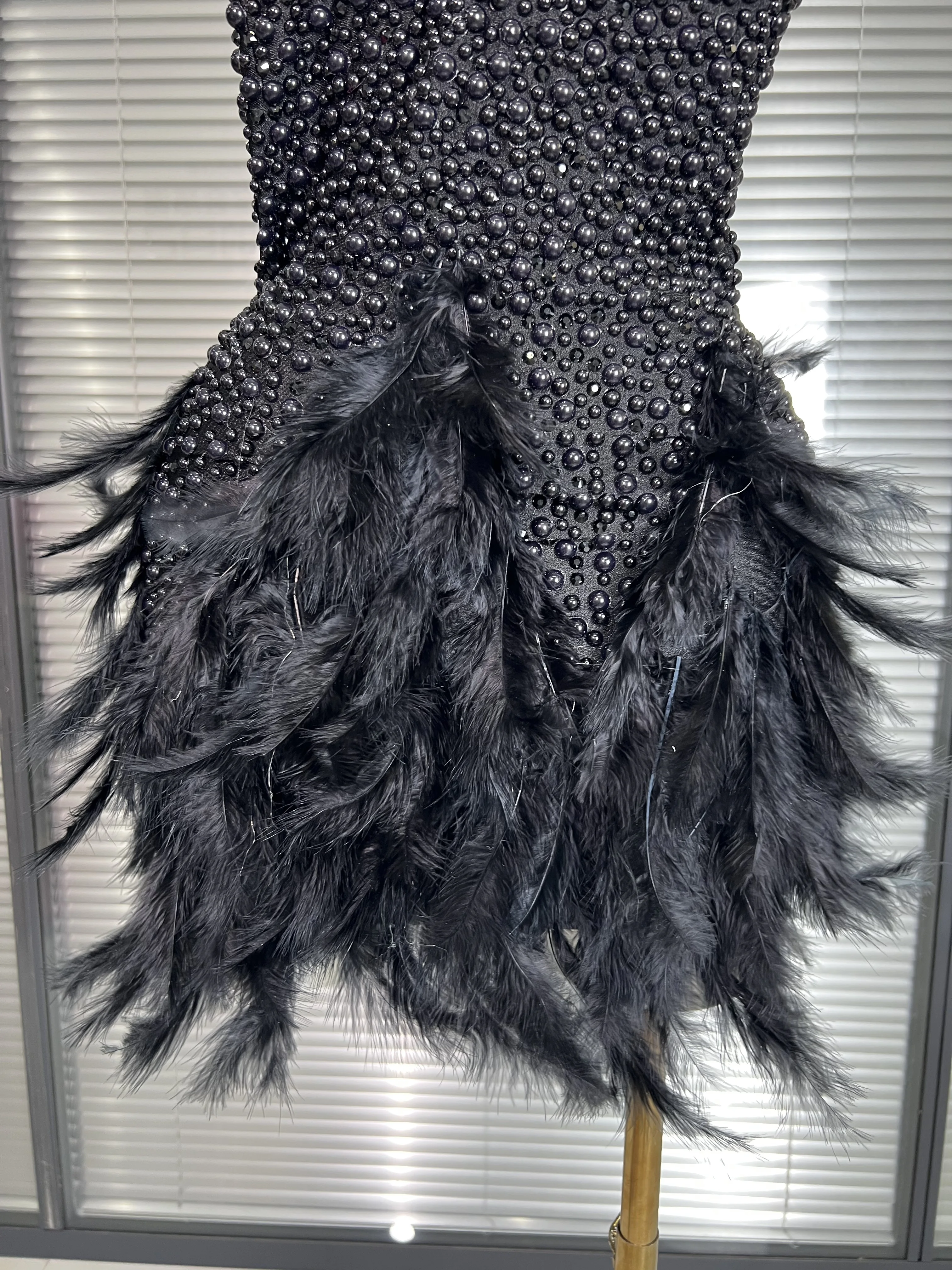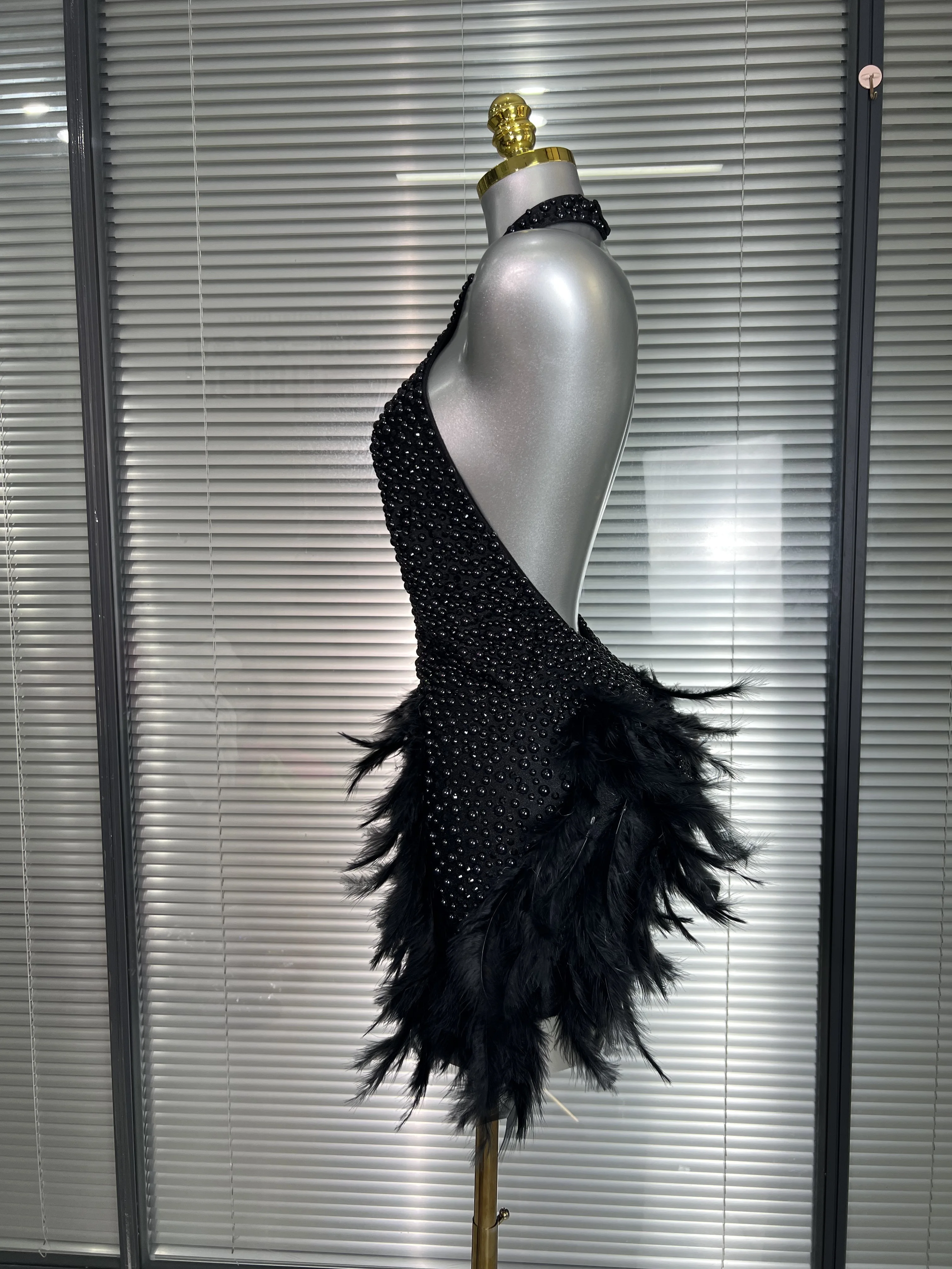 INS New Women Sexy Backless Feathers Performance Costume Stage Dancer Black Mini