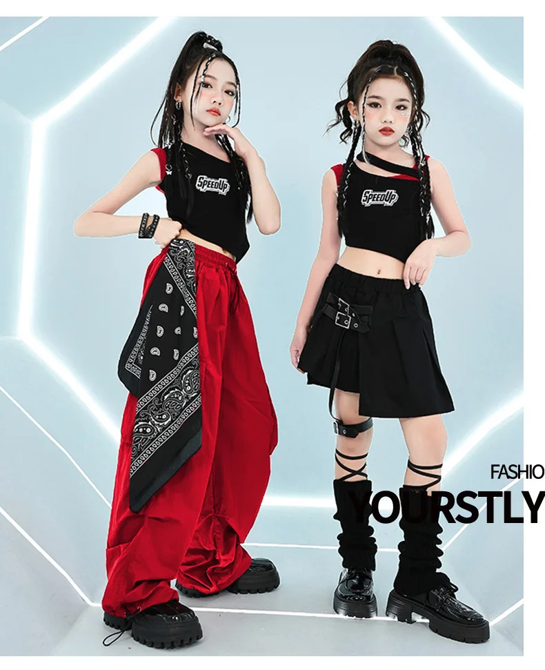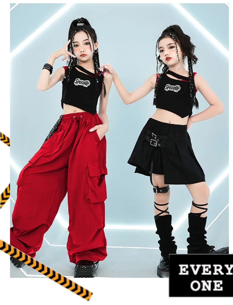 Kids Street Dance Jazz Performance Set Girls Hip Hop Black Sleeveless Crop Top R