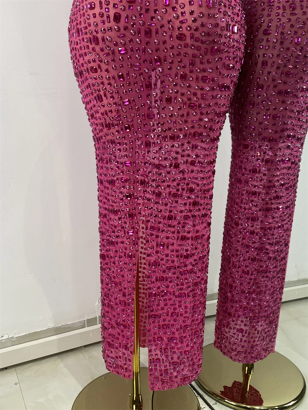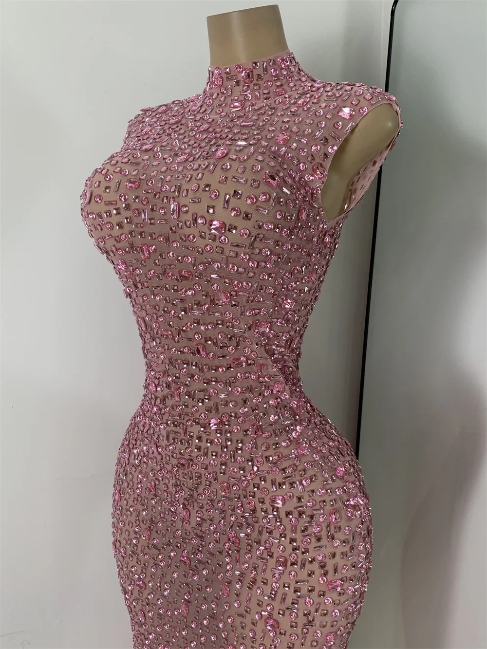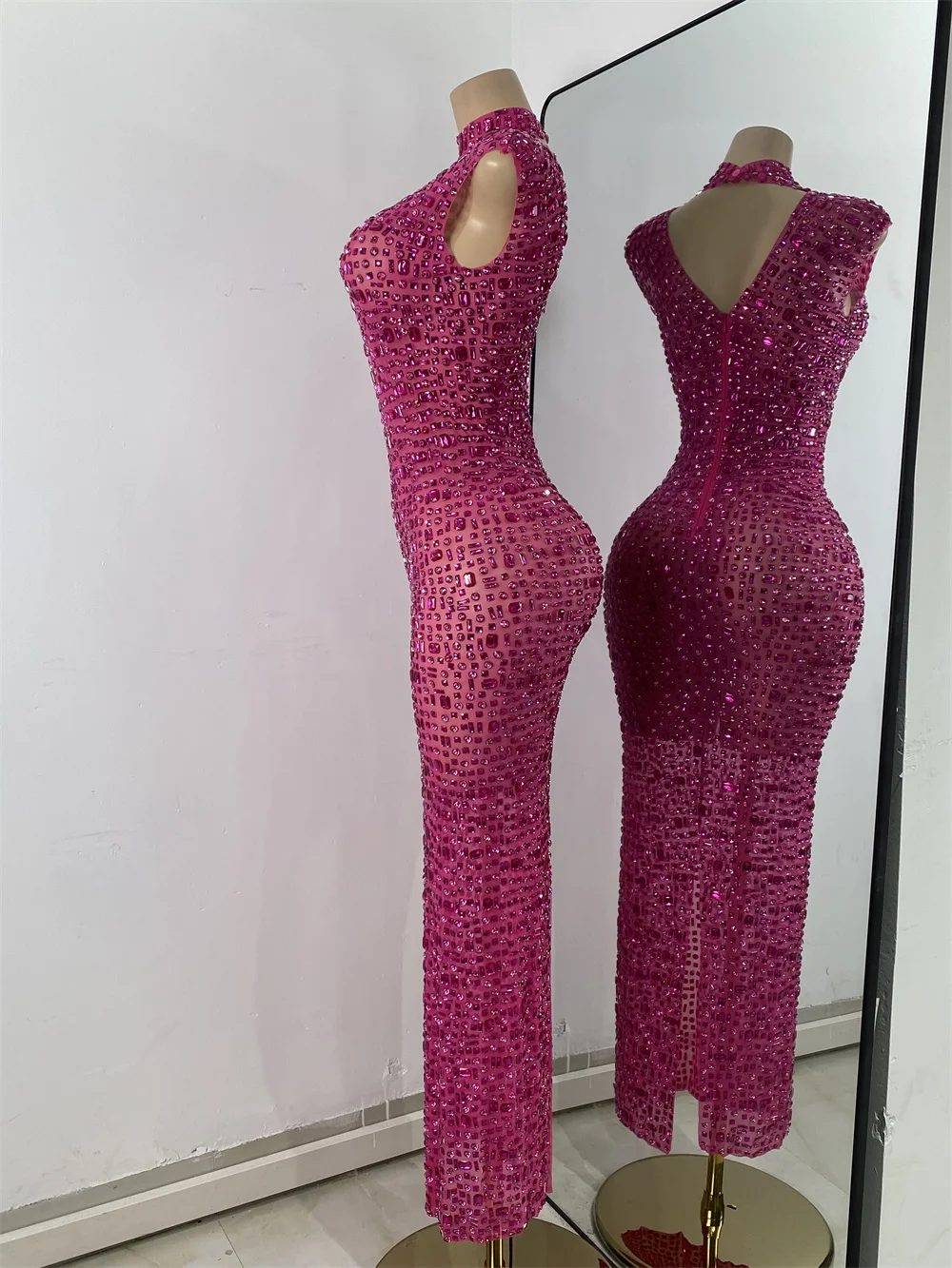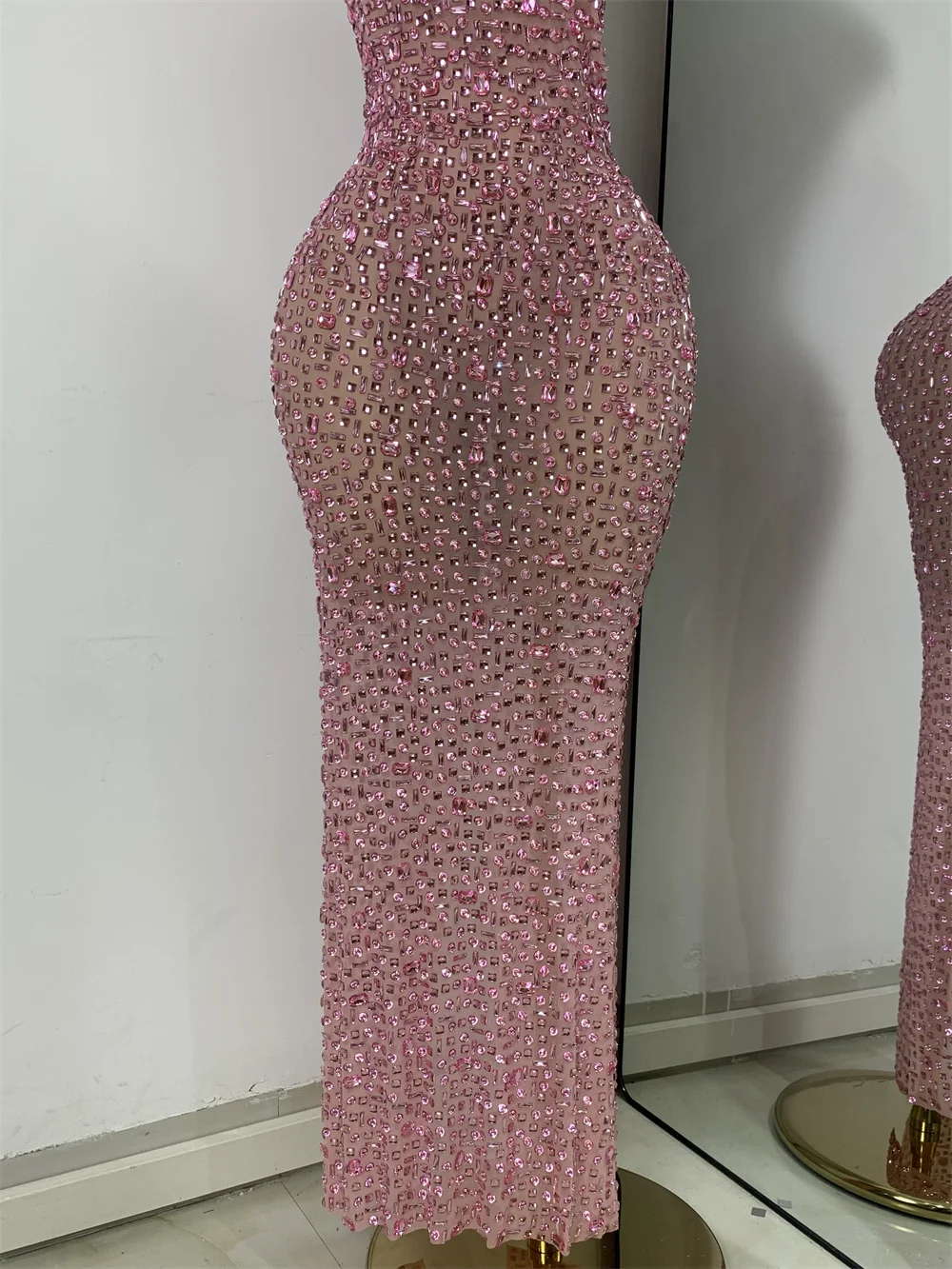Luxury Crystal Diamonds Long Party Dress Sexy Mesh Sleeveless See Through Evenin