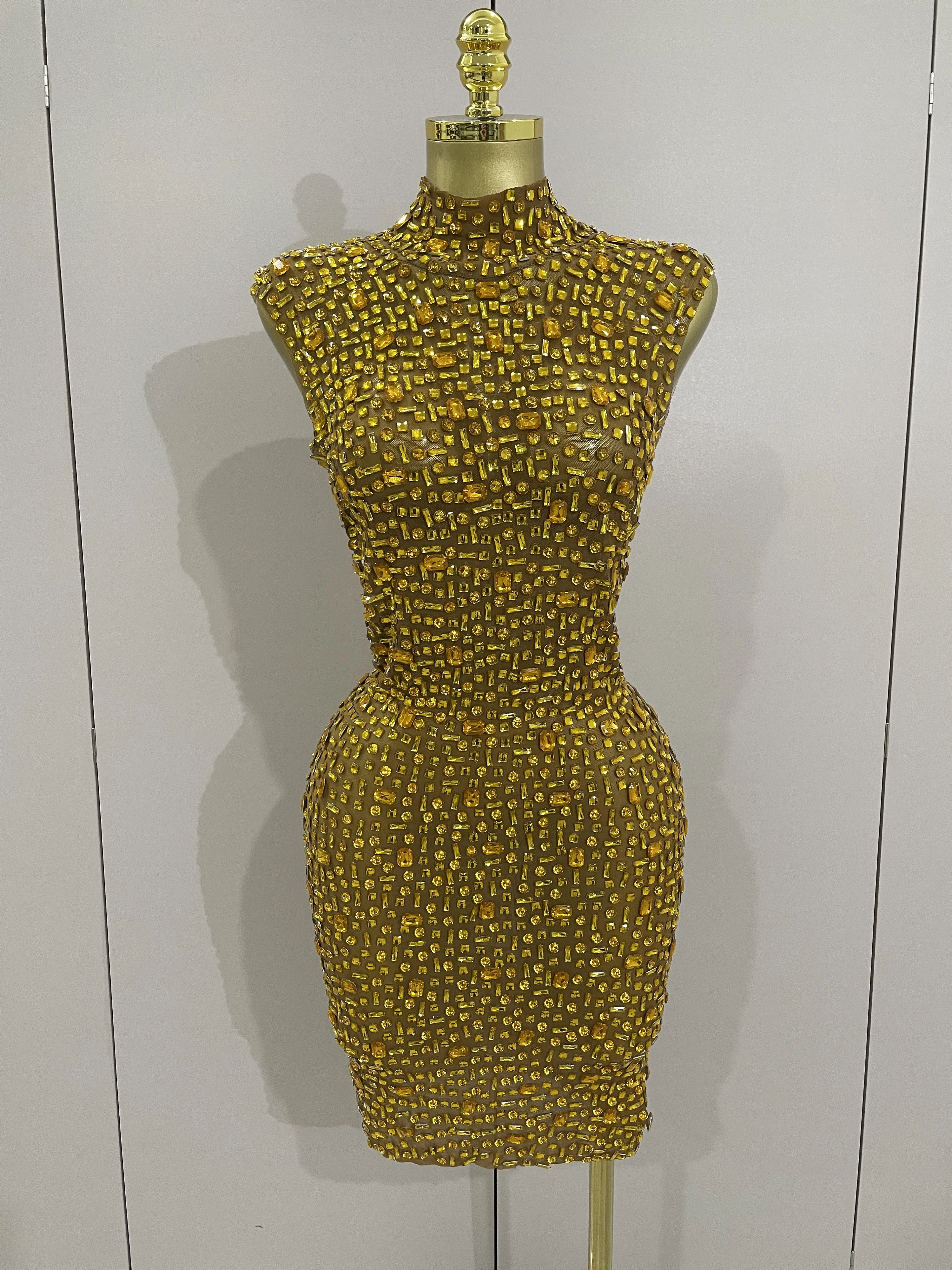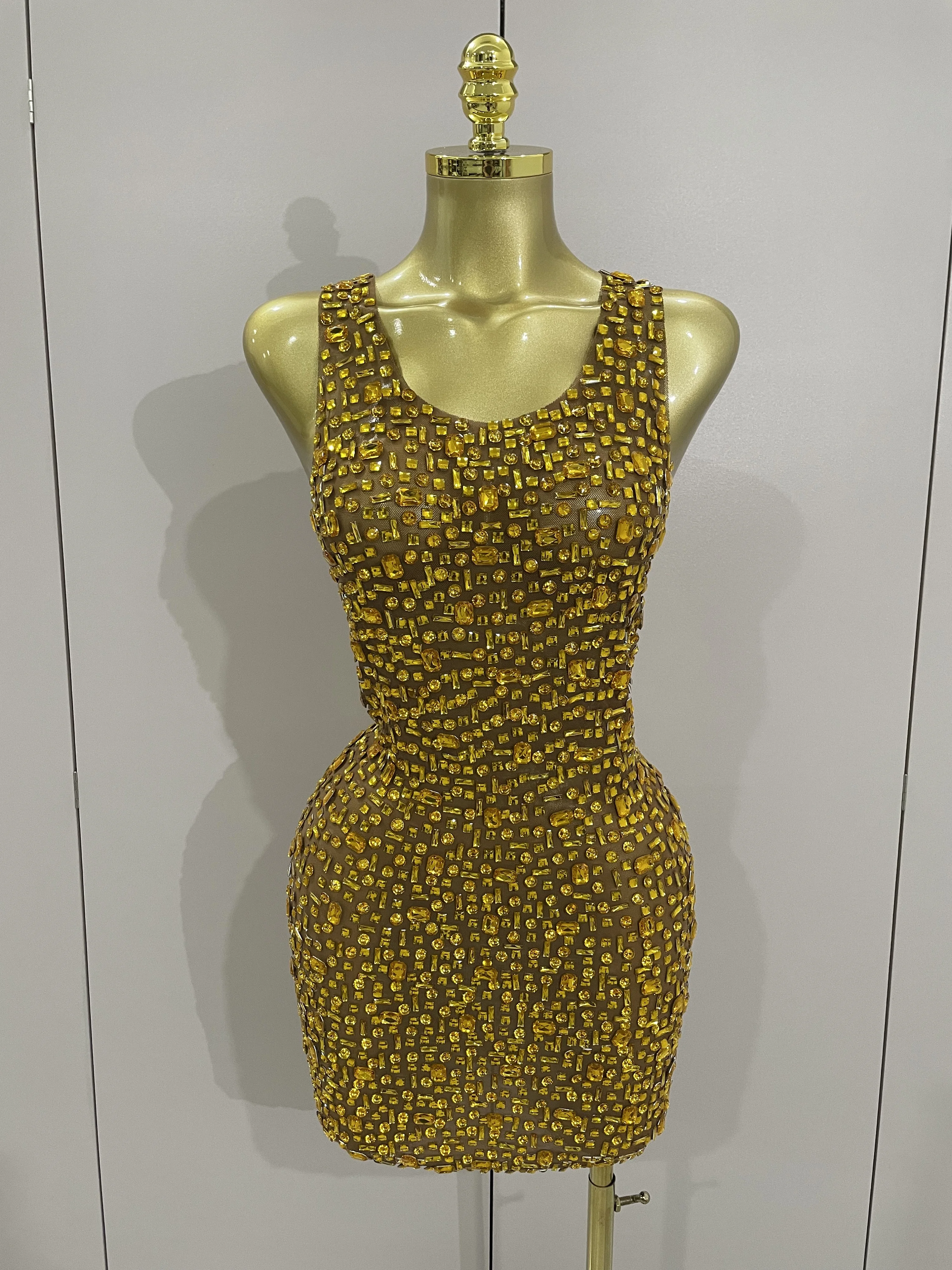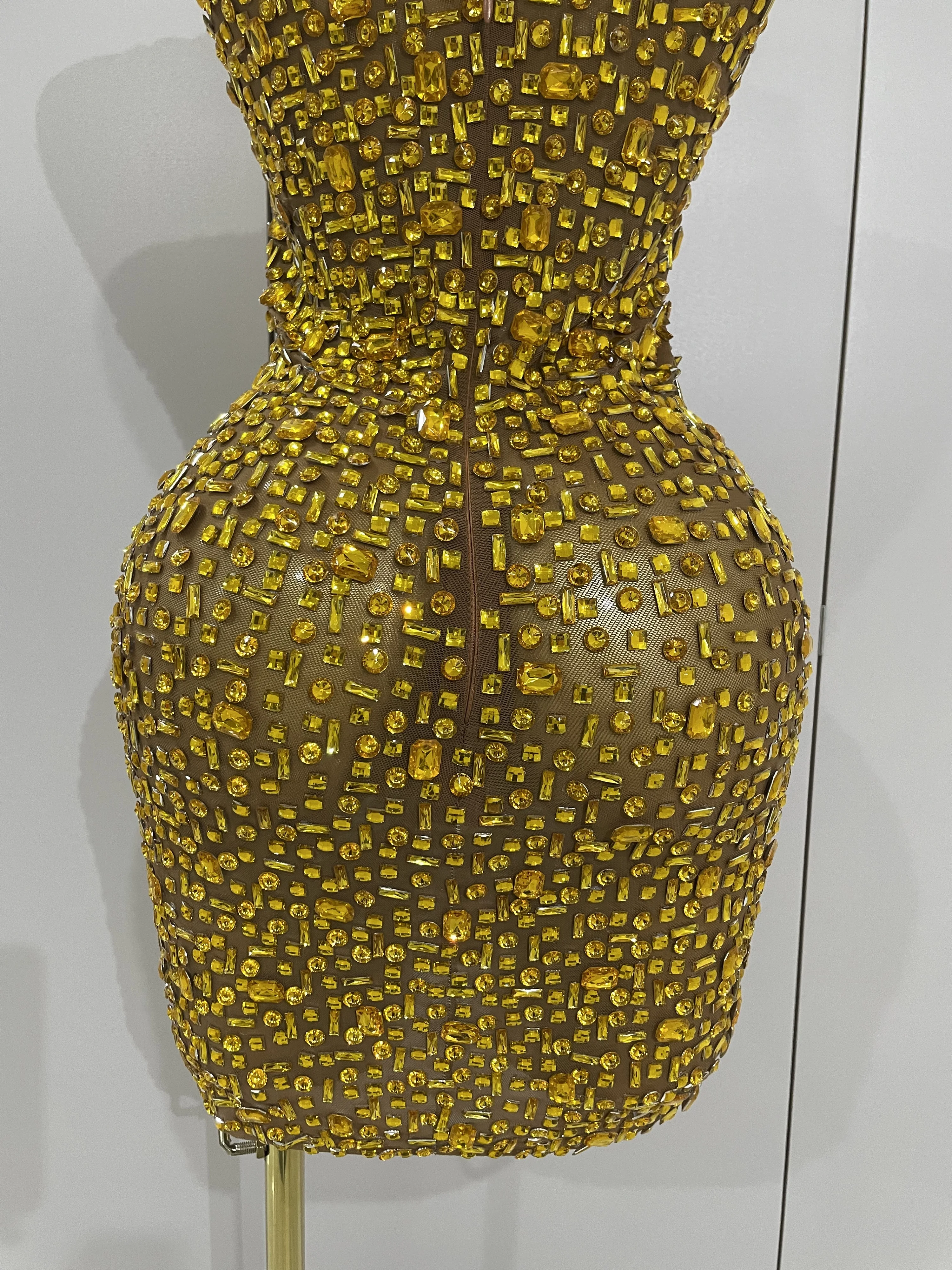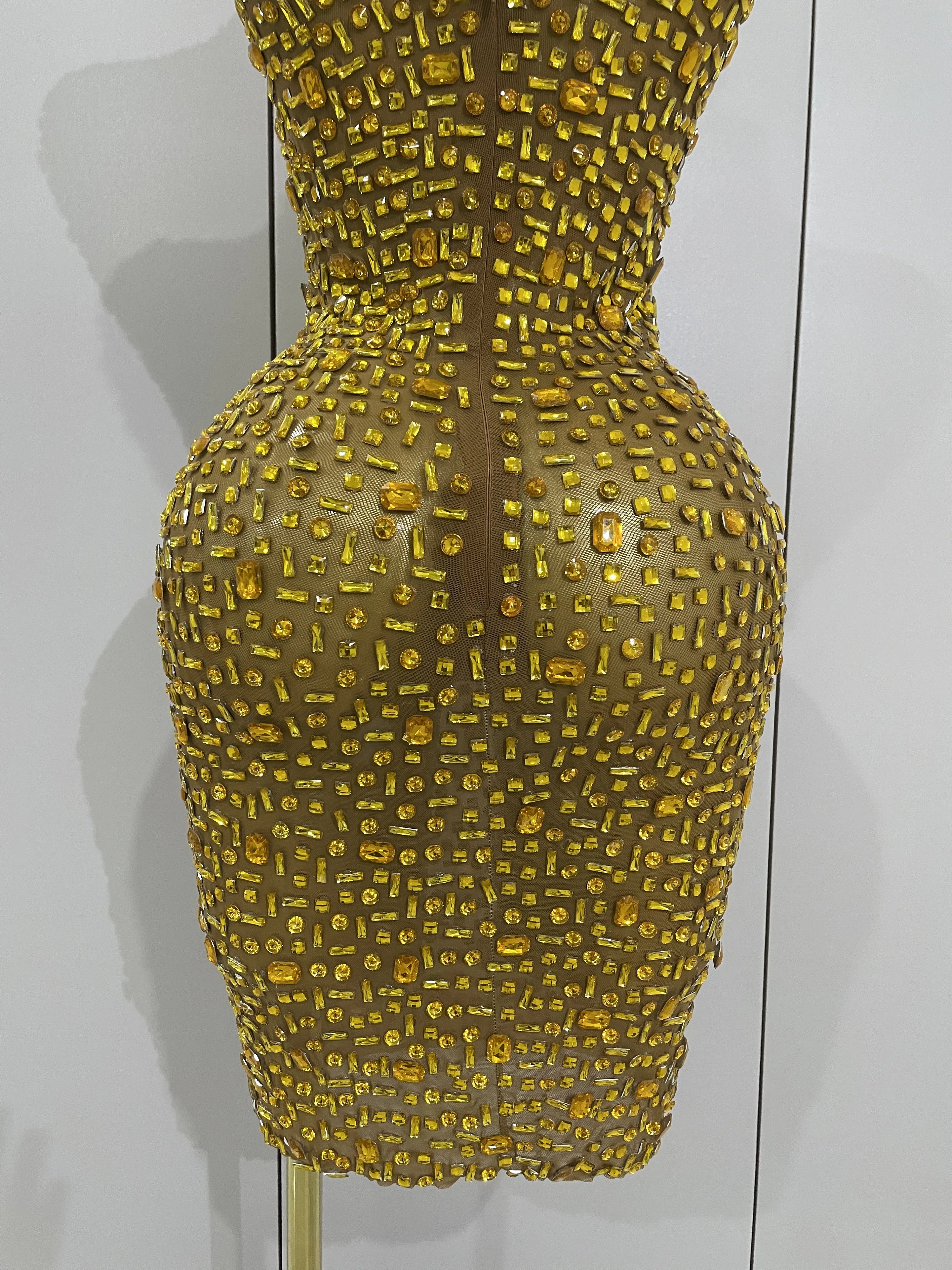 Luxury Gold Sparkly Rhinestone Sexy Mesh Short Dress Women Elegant Evening Party