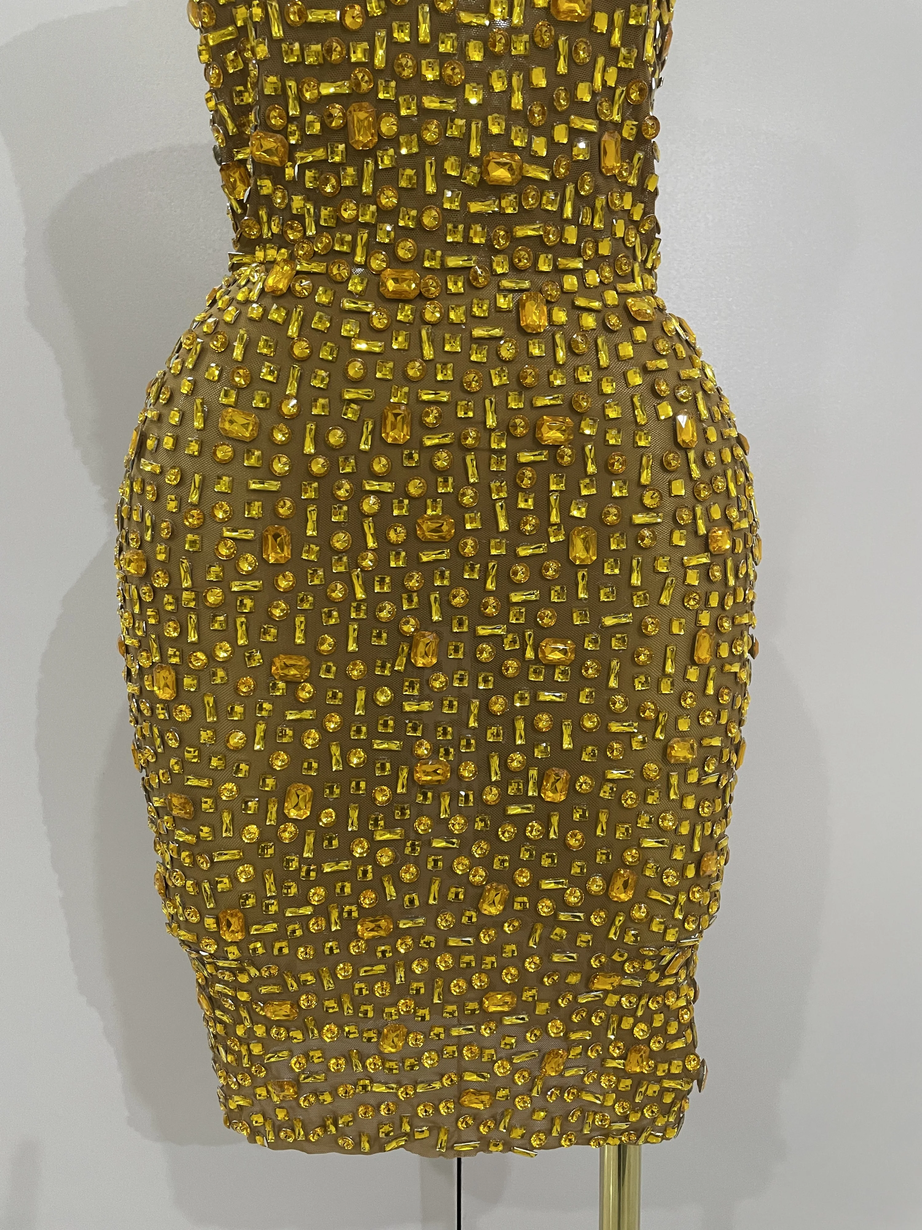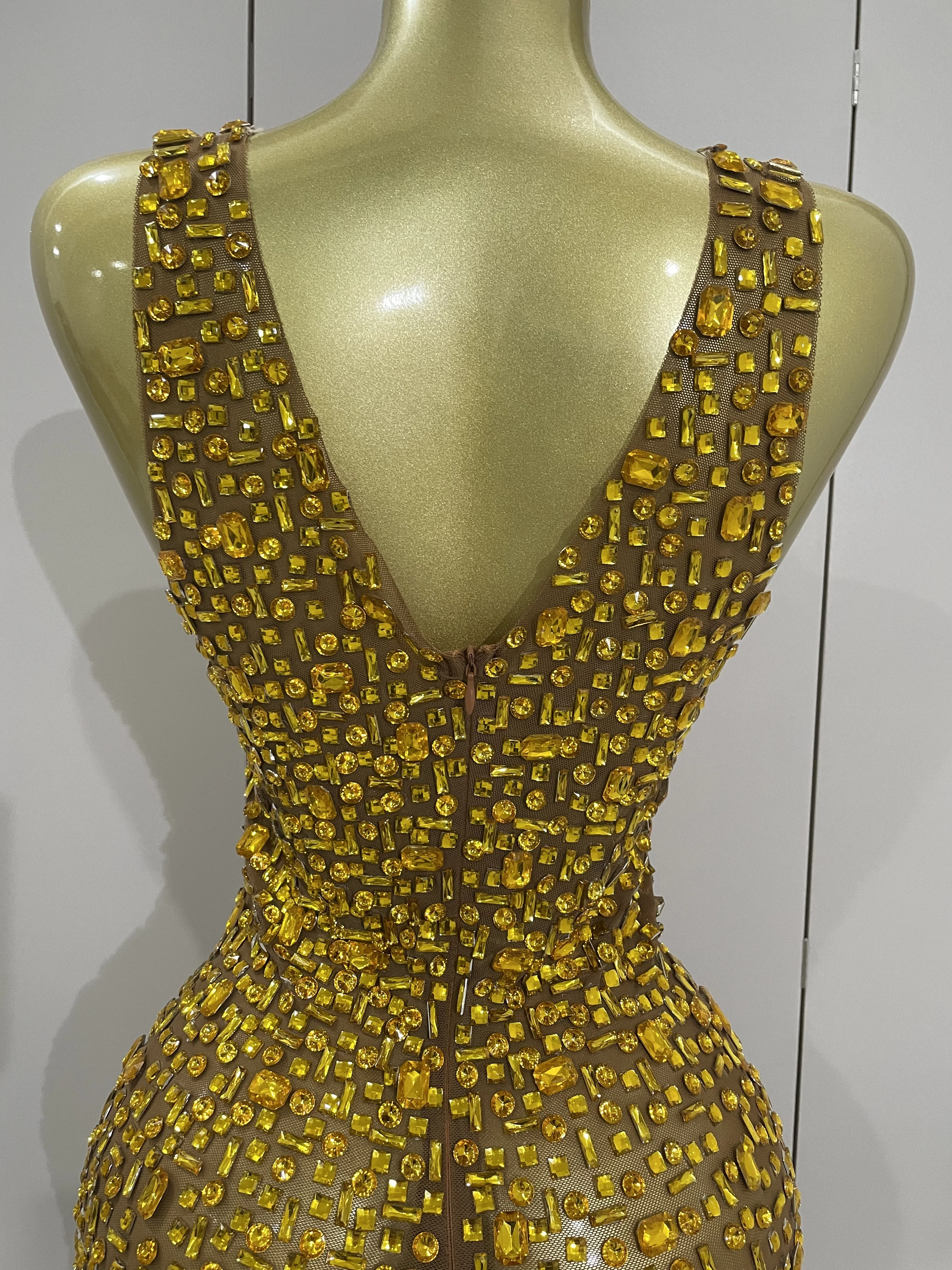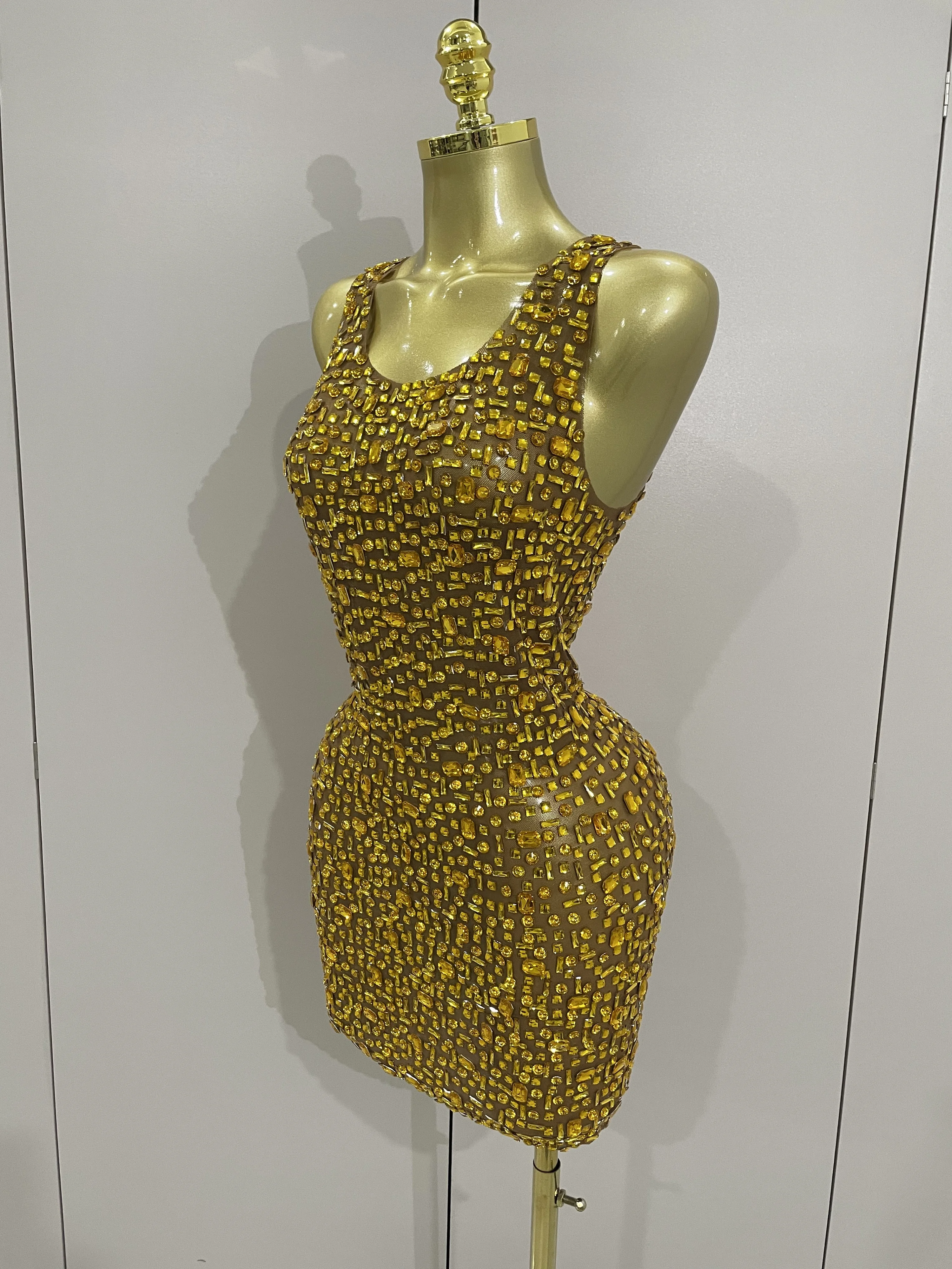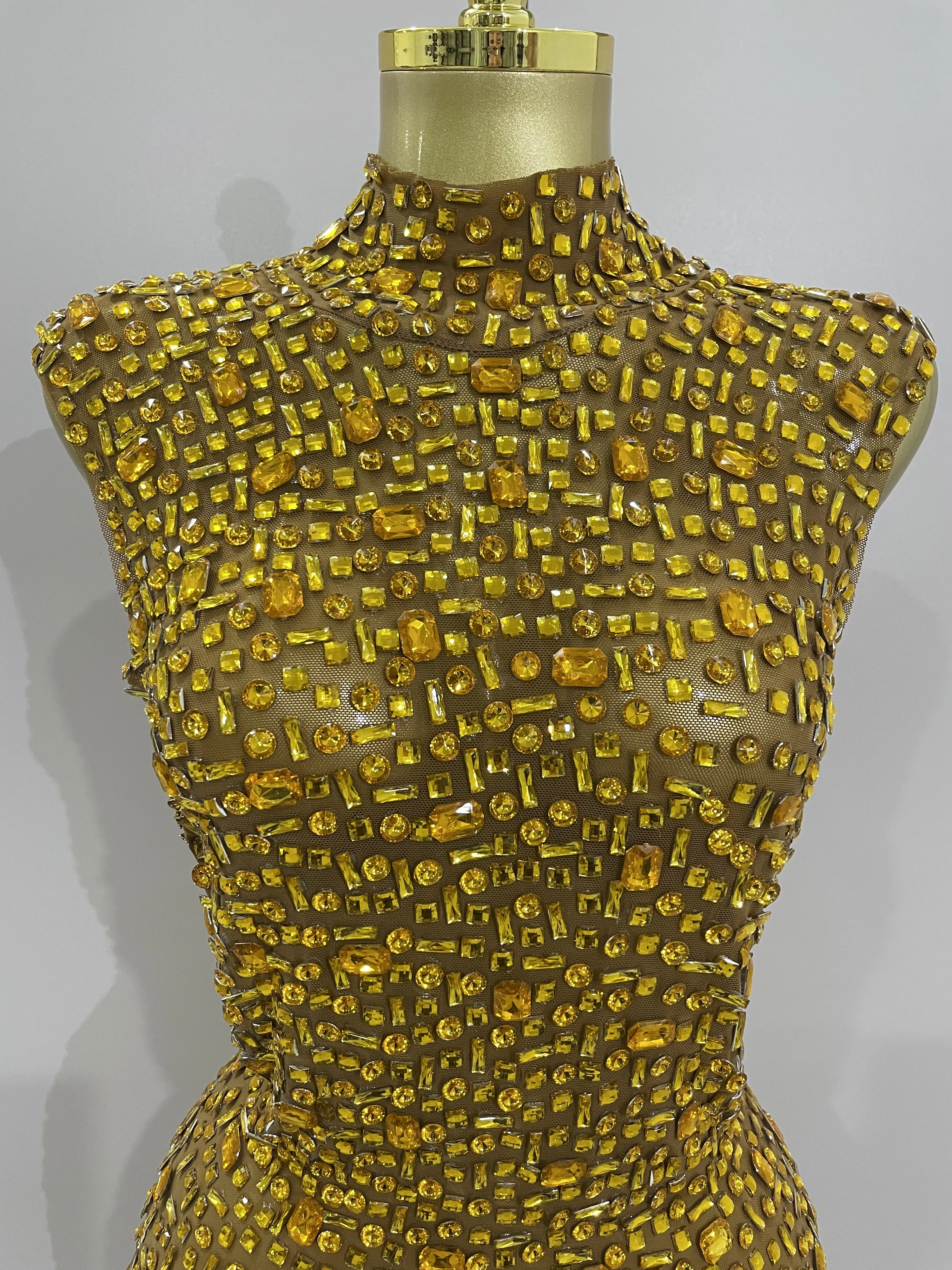 Luxury Gold Sparkly Rhinestone Sexy Mesh Short Dress Women Elegant Evening Party