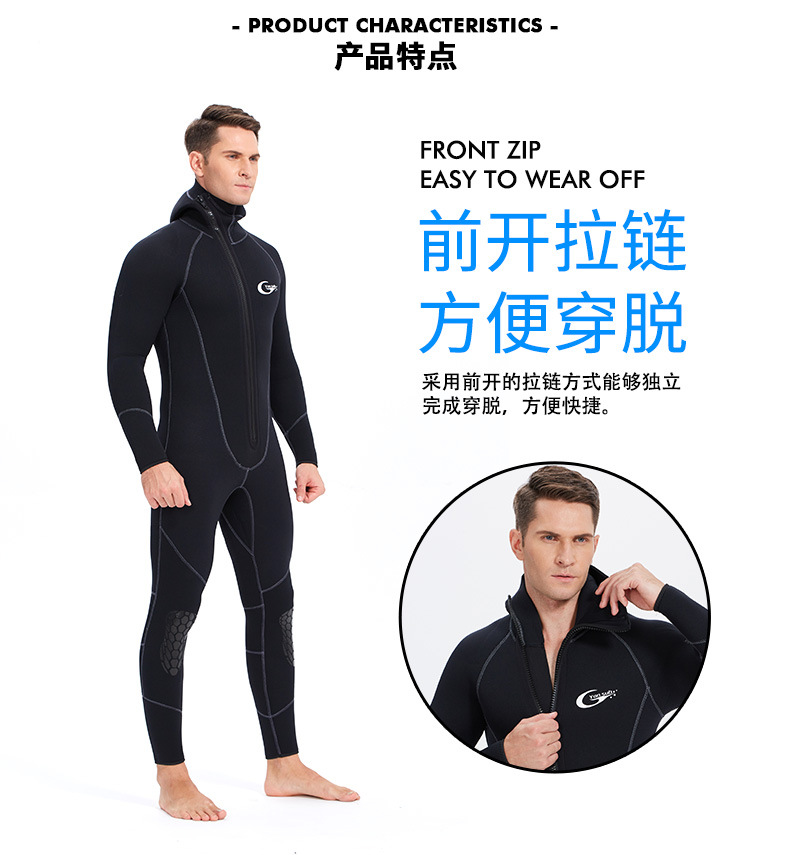 Men's 7mm Neoprene Hoodie Wetsuit, Front Zip Full Body Keep Warm Scuba Diving Su