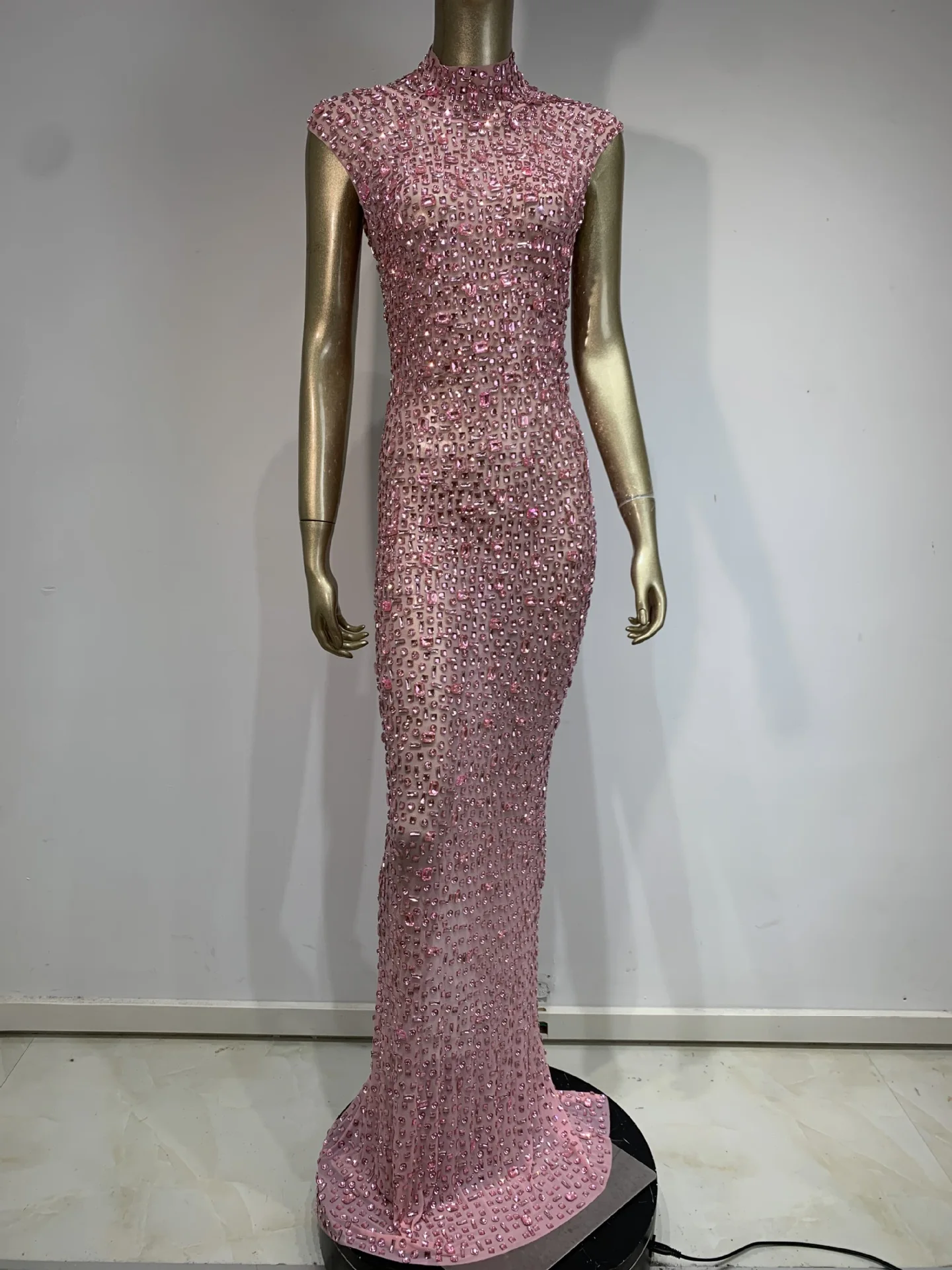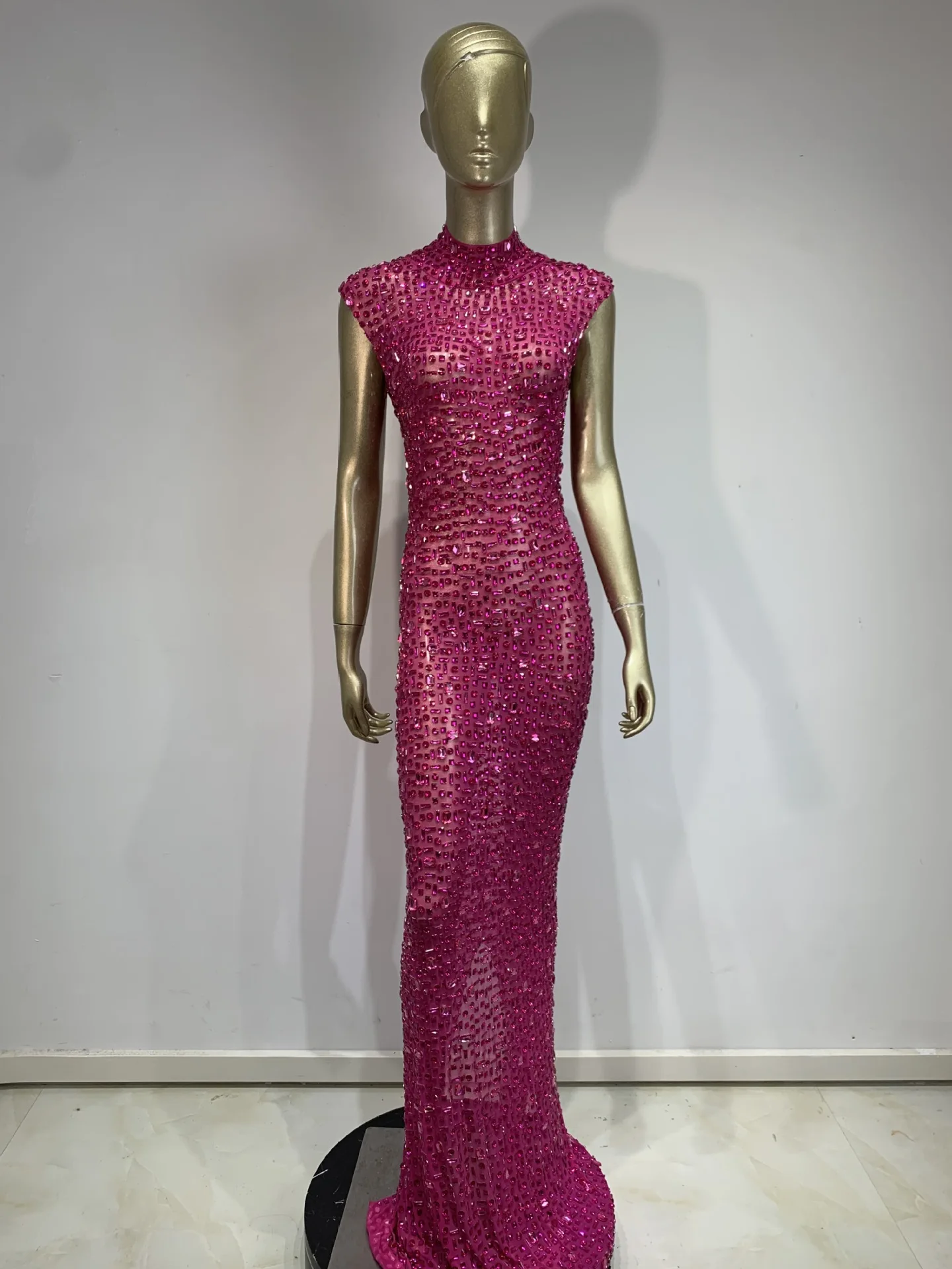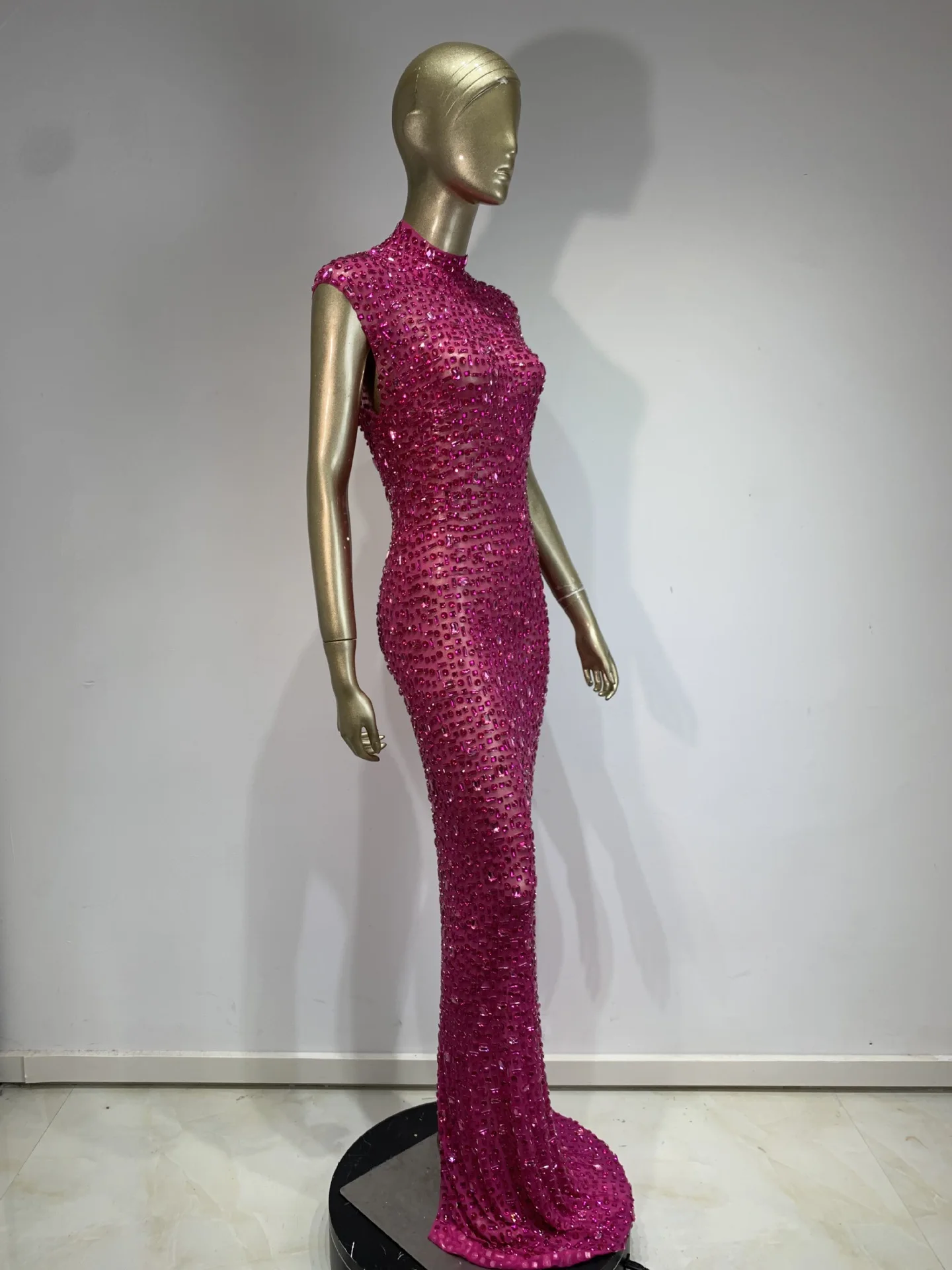 New Women Sexy Mesh Crystal Diamonds Transparent Long Maxi Dress Hot Pink Party