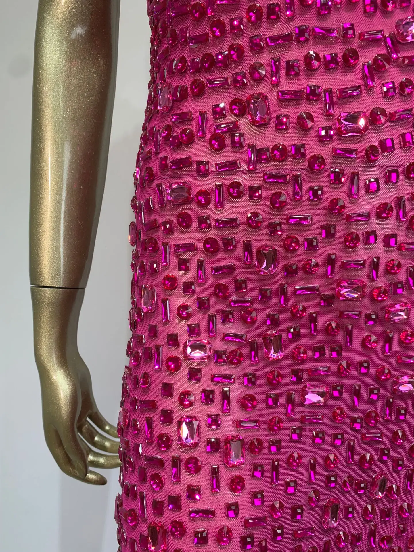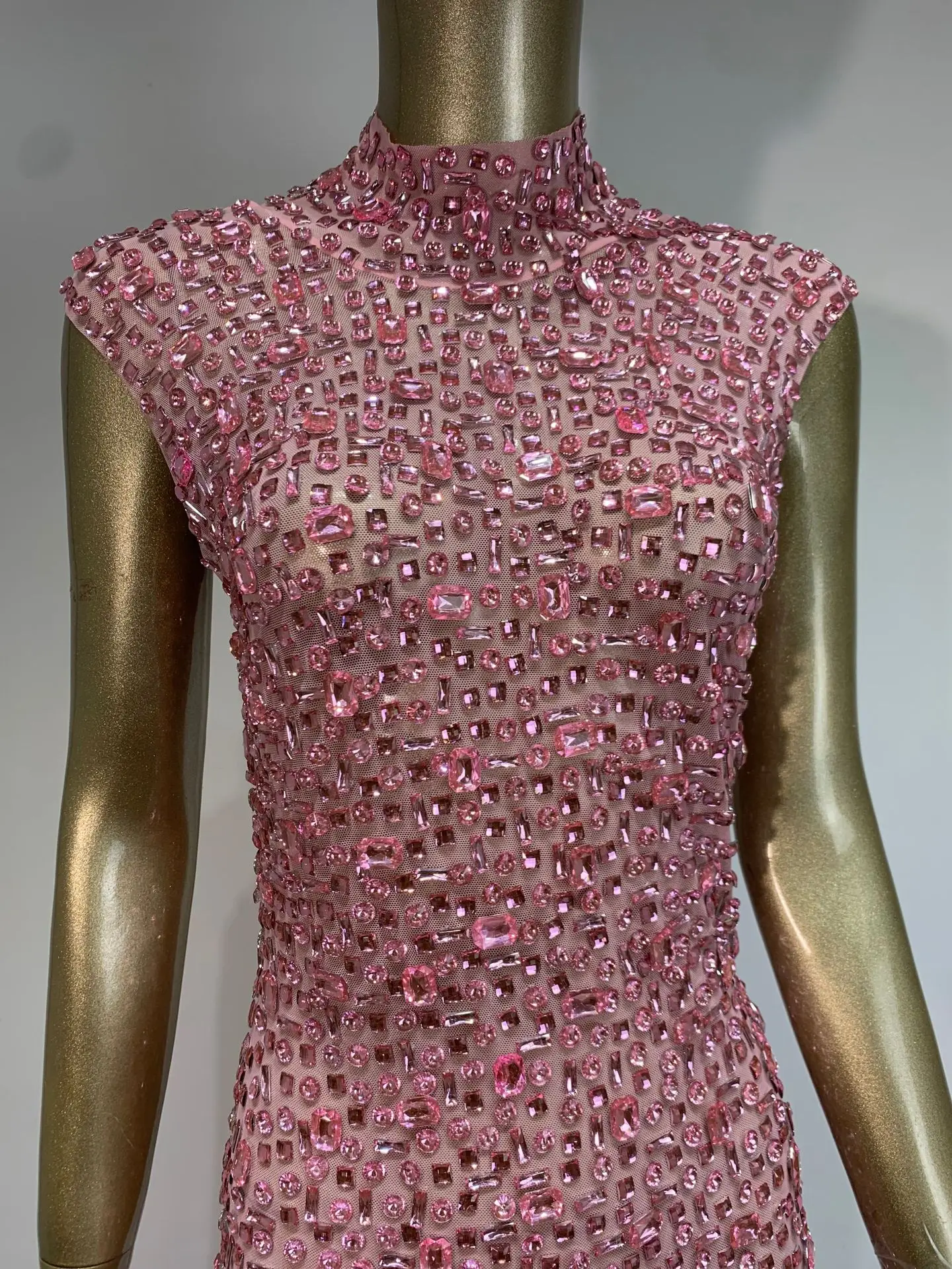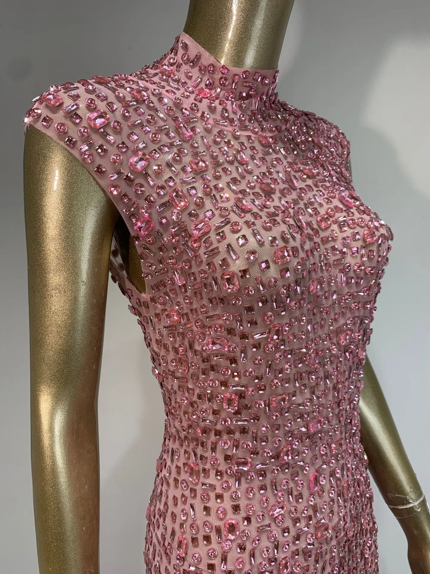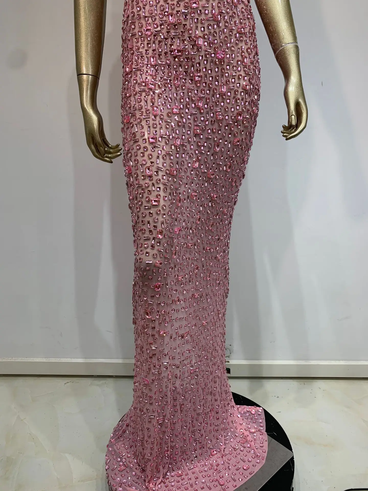 New Women Sexy Mesh Crystal Diamonds Transparent Long Maxi Dress Hot Pink Party