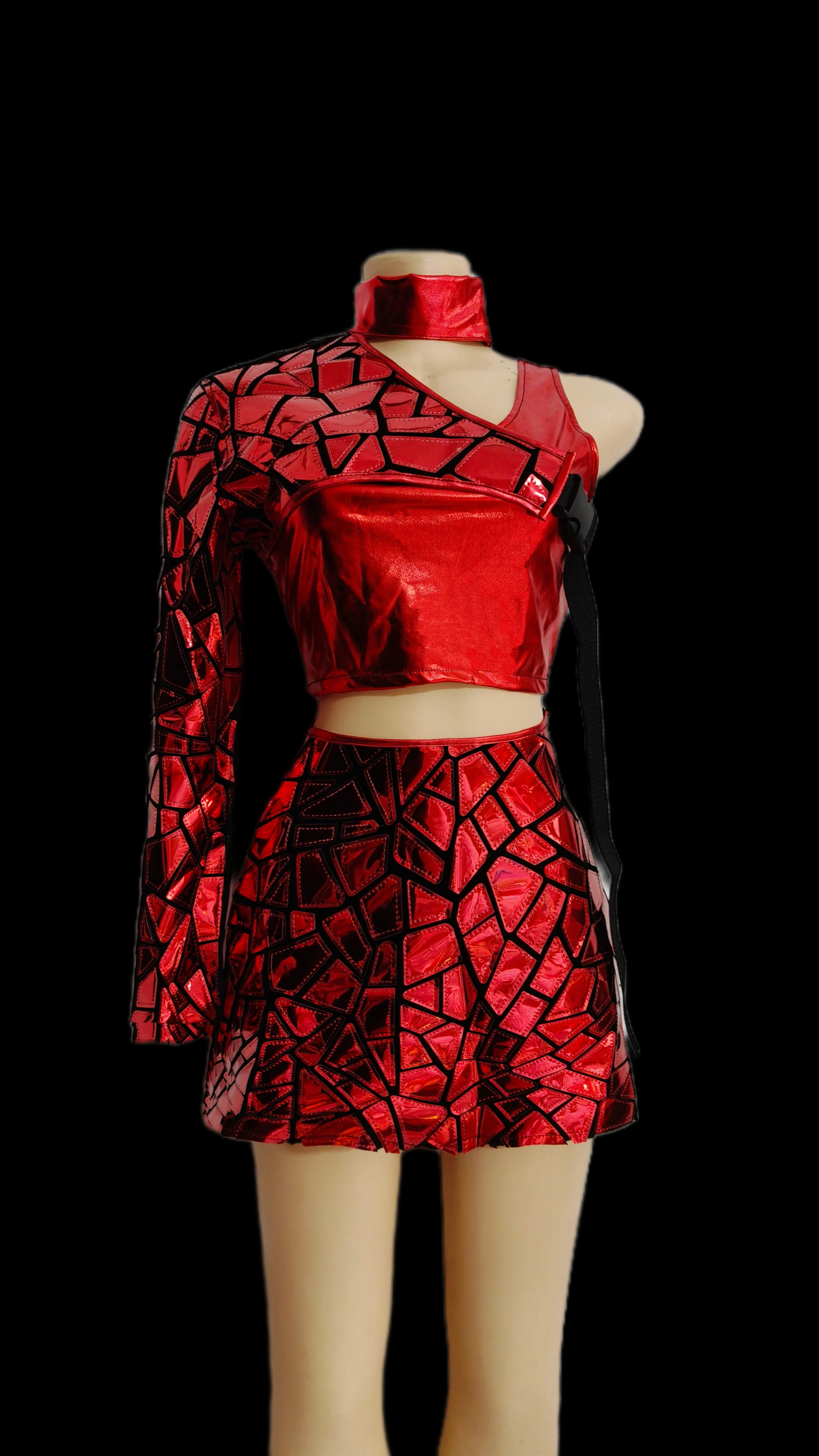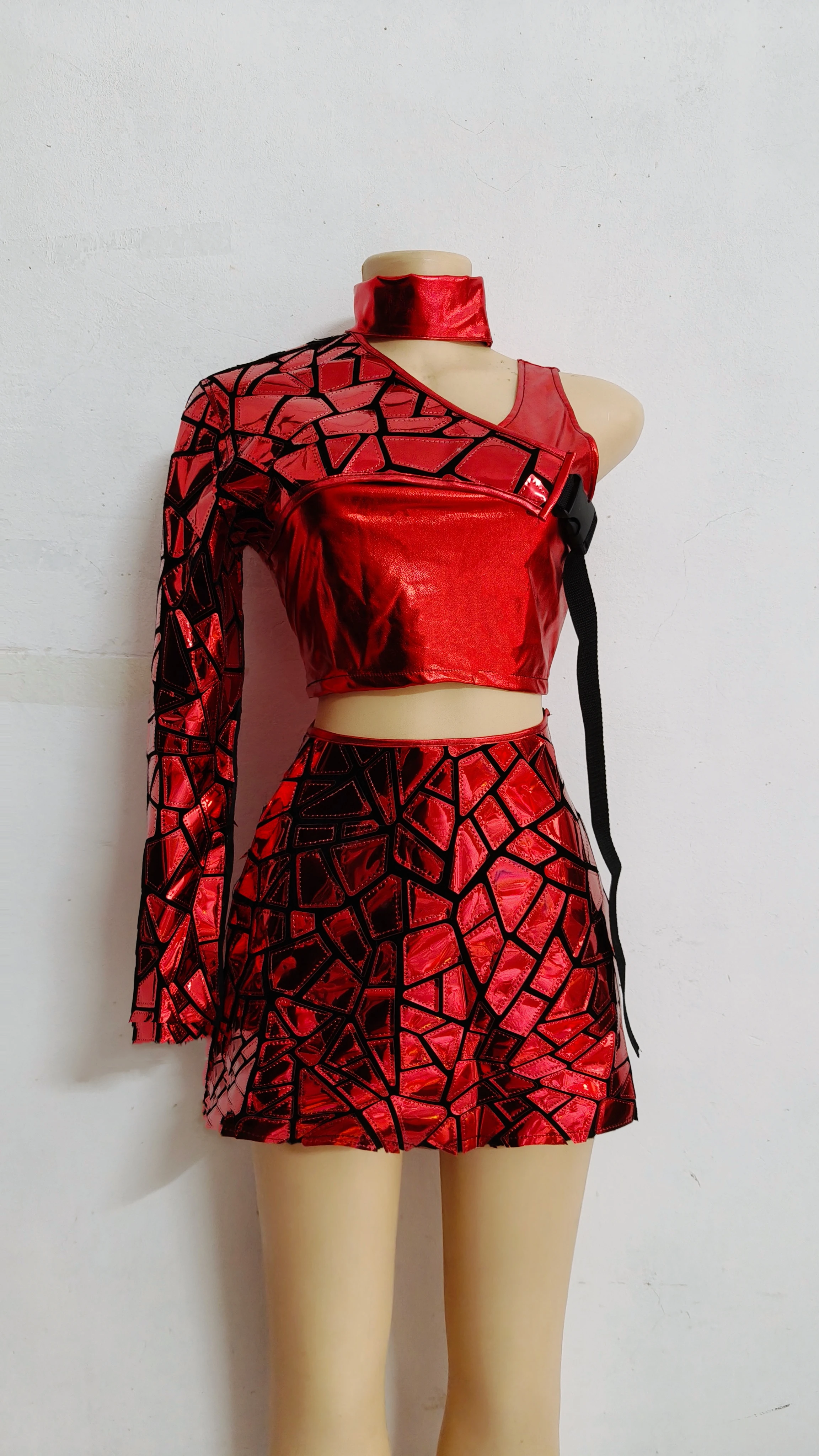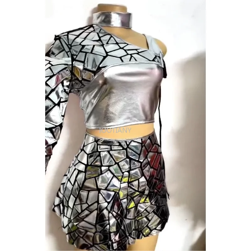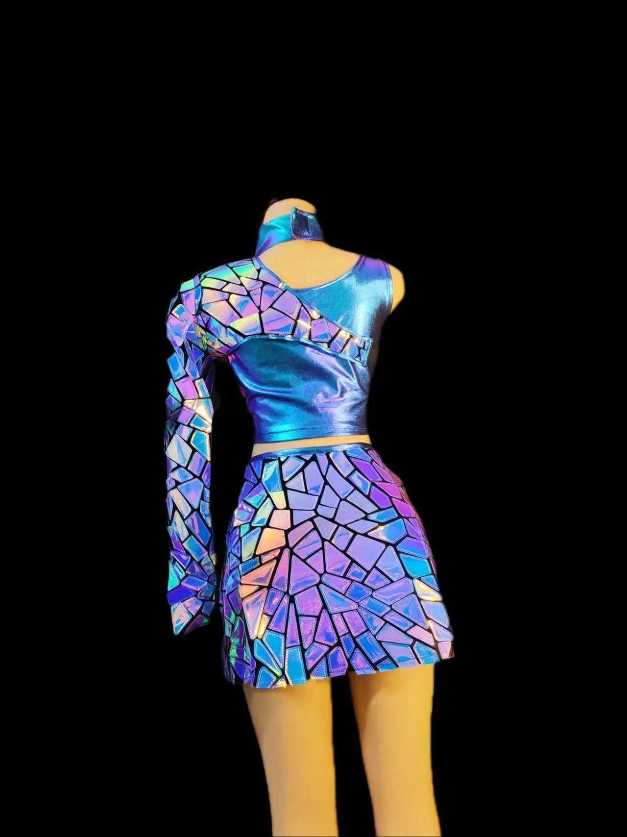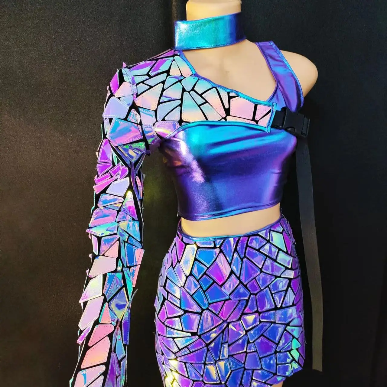 Purple Blue Mirror Outfits Sequins Laser Mirror Single Shoulder Vest Outfit Sexy