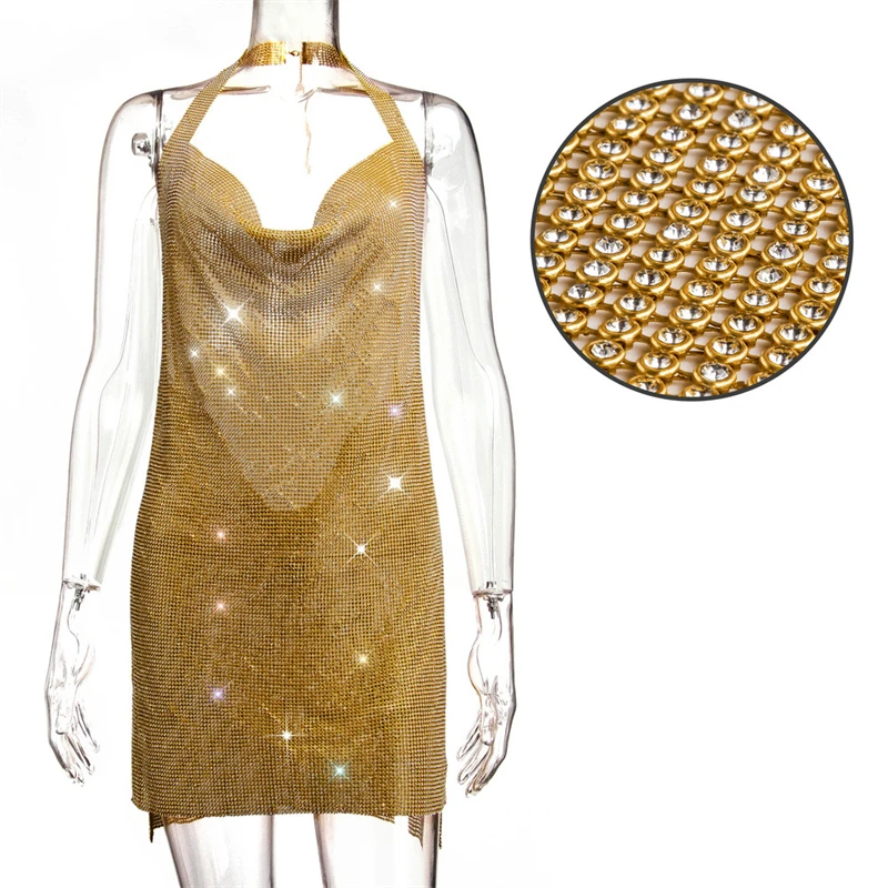 Sexy Backless V Neck Mini Dress For Women Shiny Rhinestone Halter Neck Sleeveles
