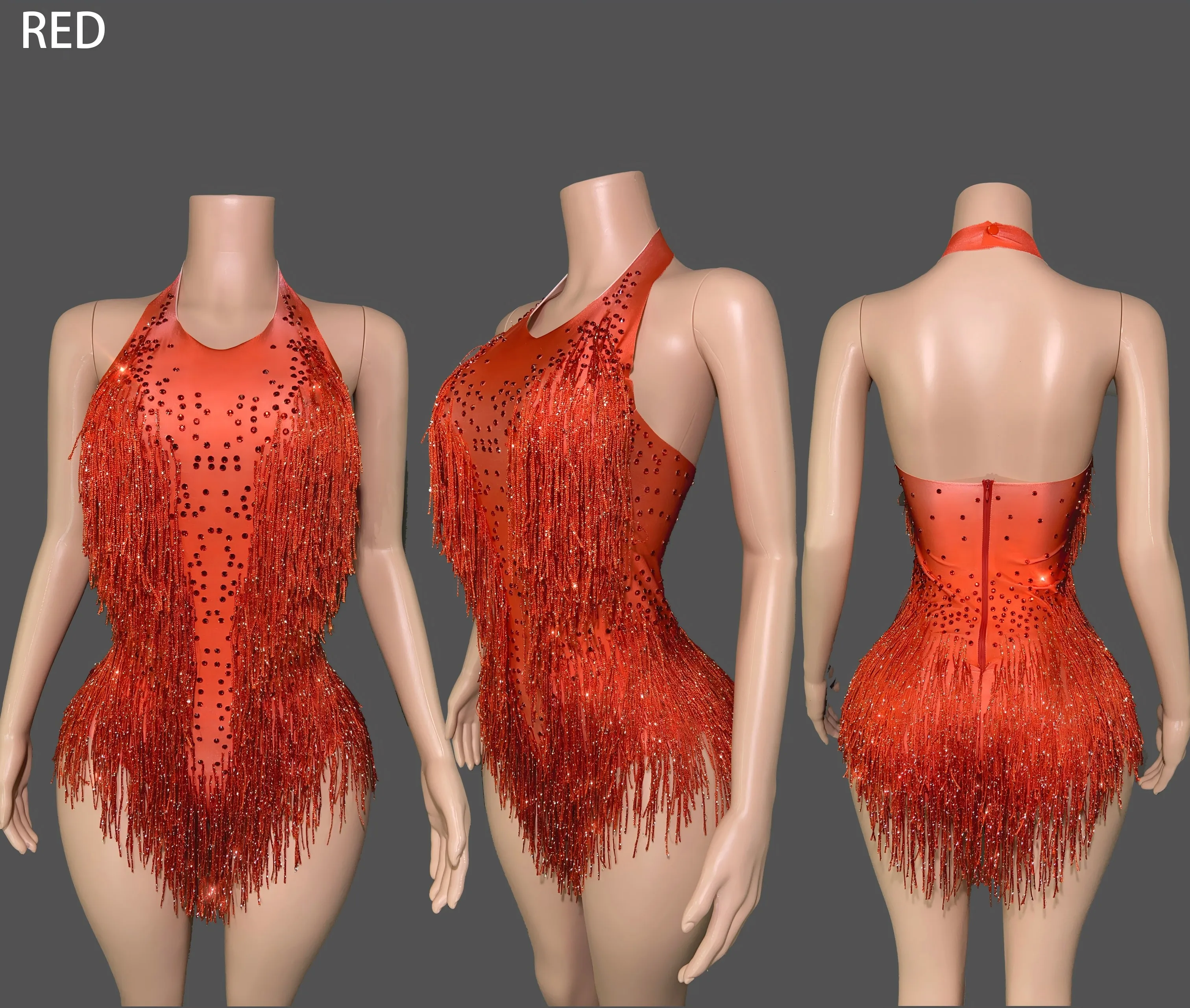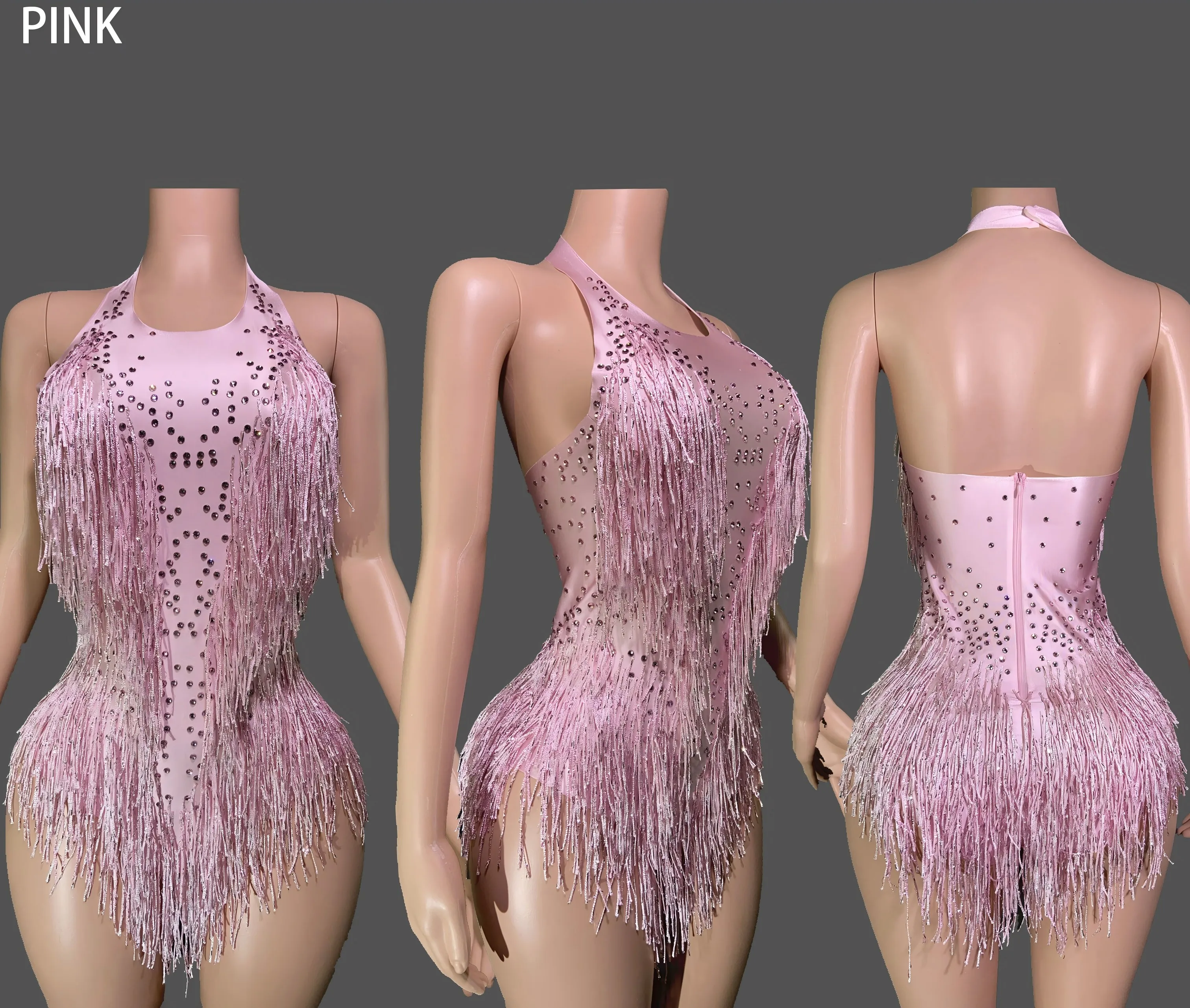 Sparkly Crystals  Fringe Bodysuit Women DJ Jazz Dance Costume With Rhinestones S