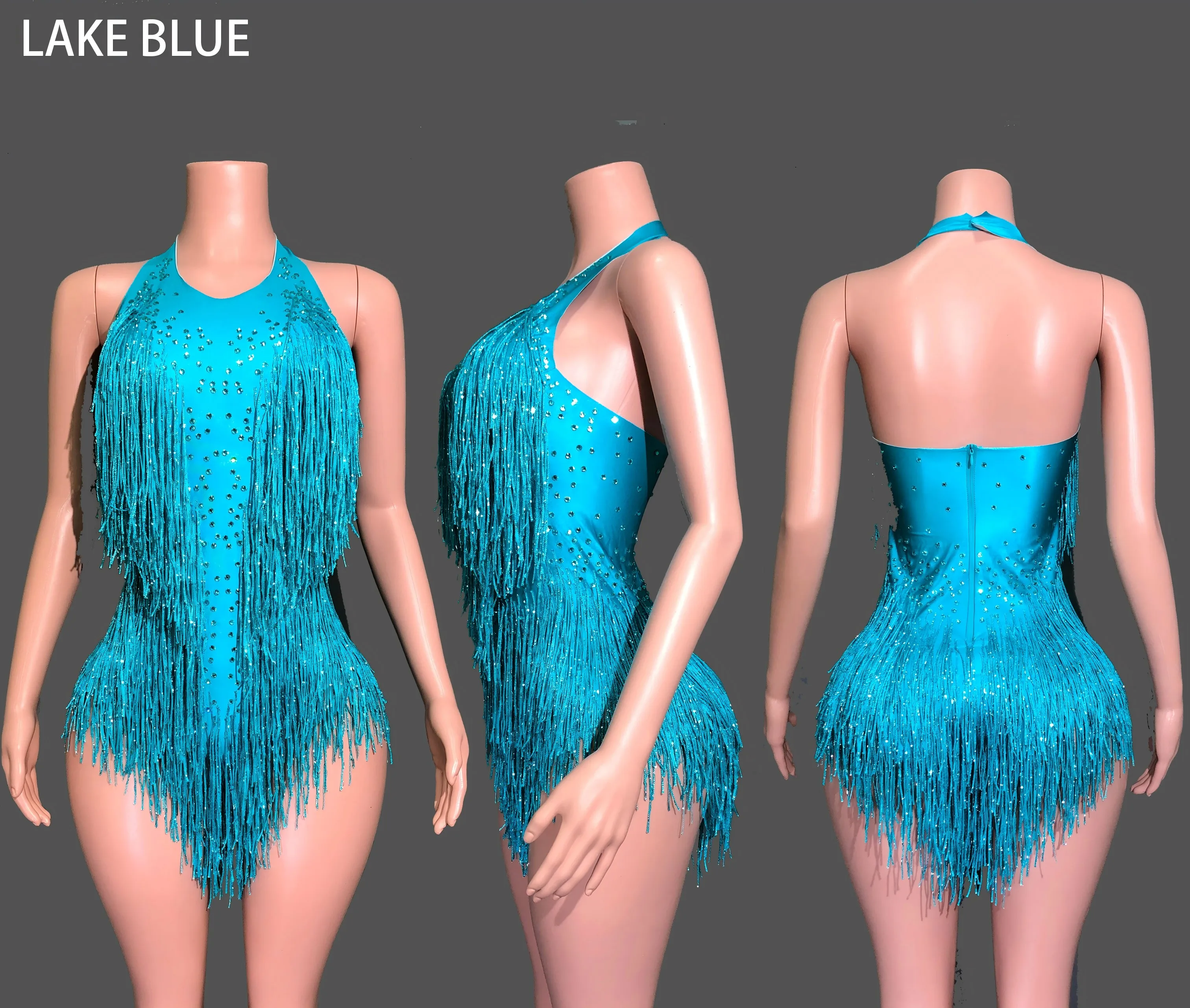 Sparkly Crystals Fringe Bodysuit Women DJ Jazz Dance Costume With Rhinestones S