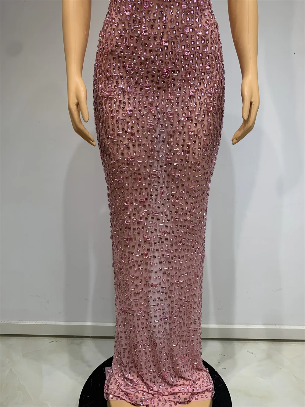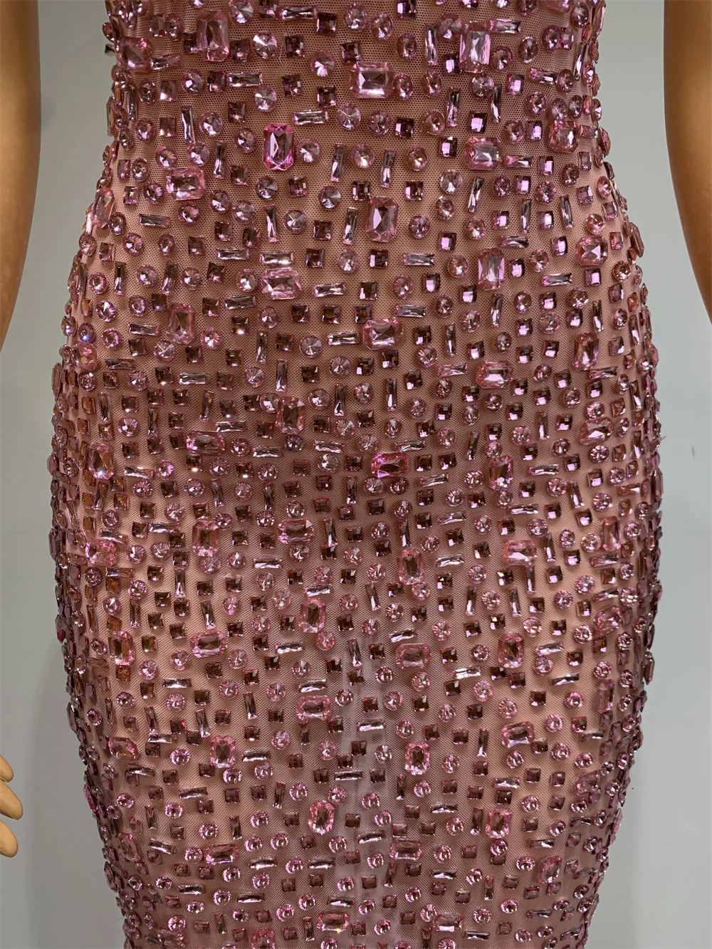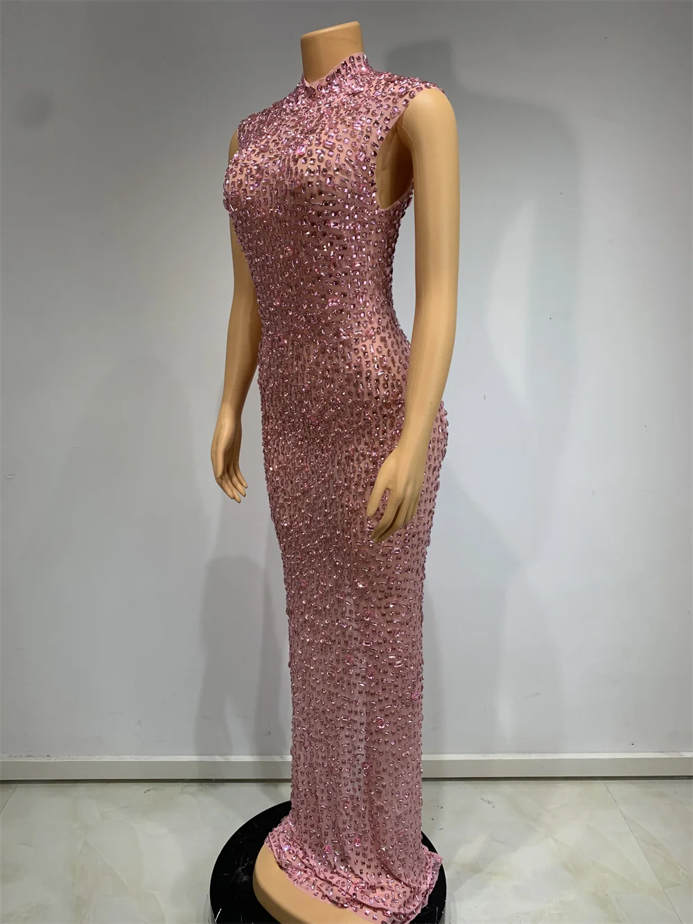 Sparkly Pink Rhinstones Long Party Dress Luxury Women Sexy Sleeveless Mesh Stret
