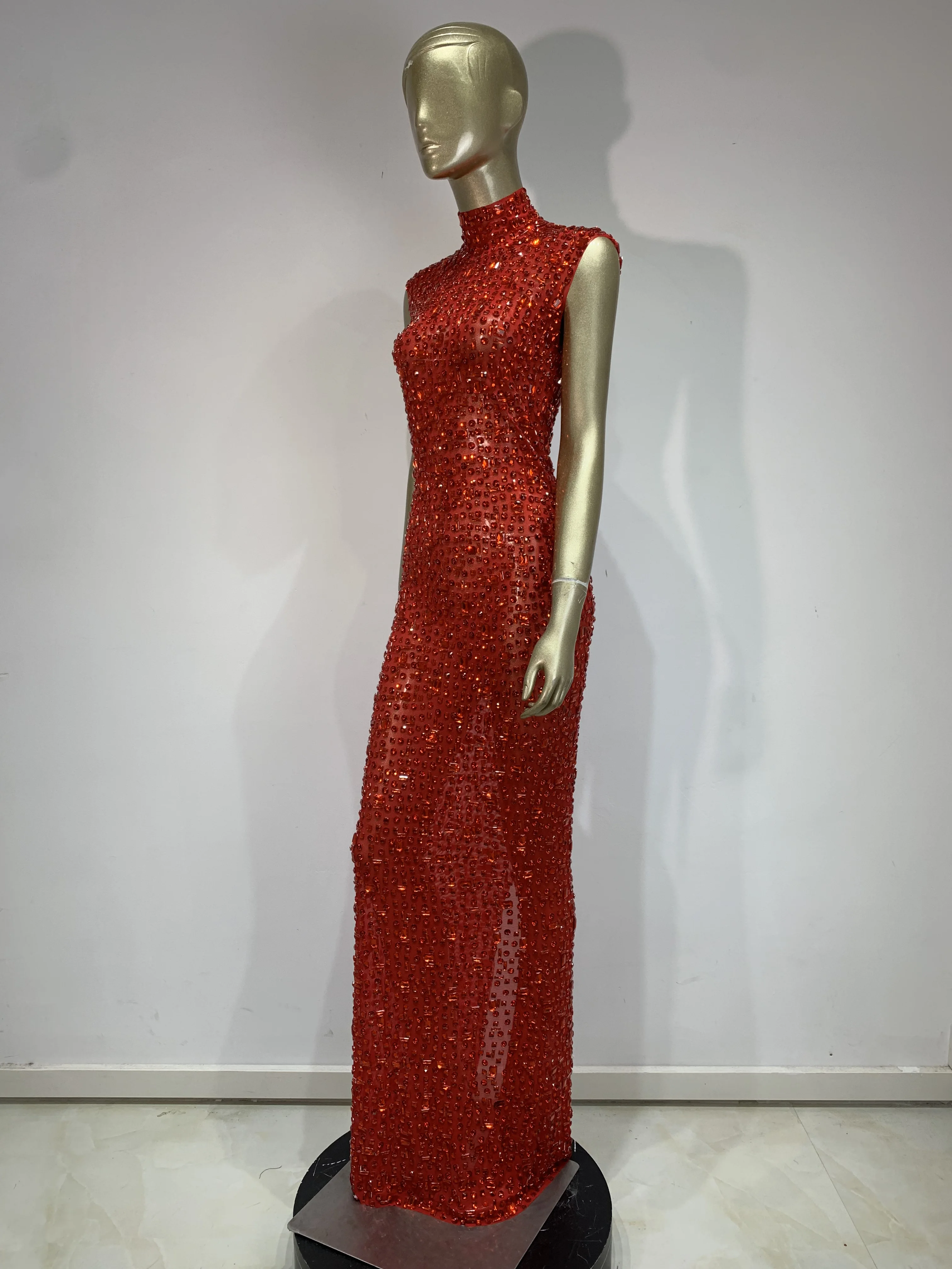 Sparkly Red Rhinestones Luxury Birthday Dresses 2025 Women Sexy Mesh Transparent