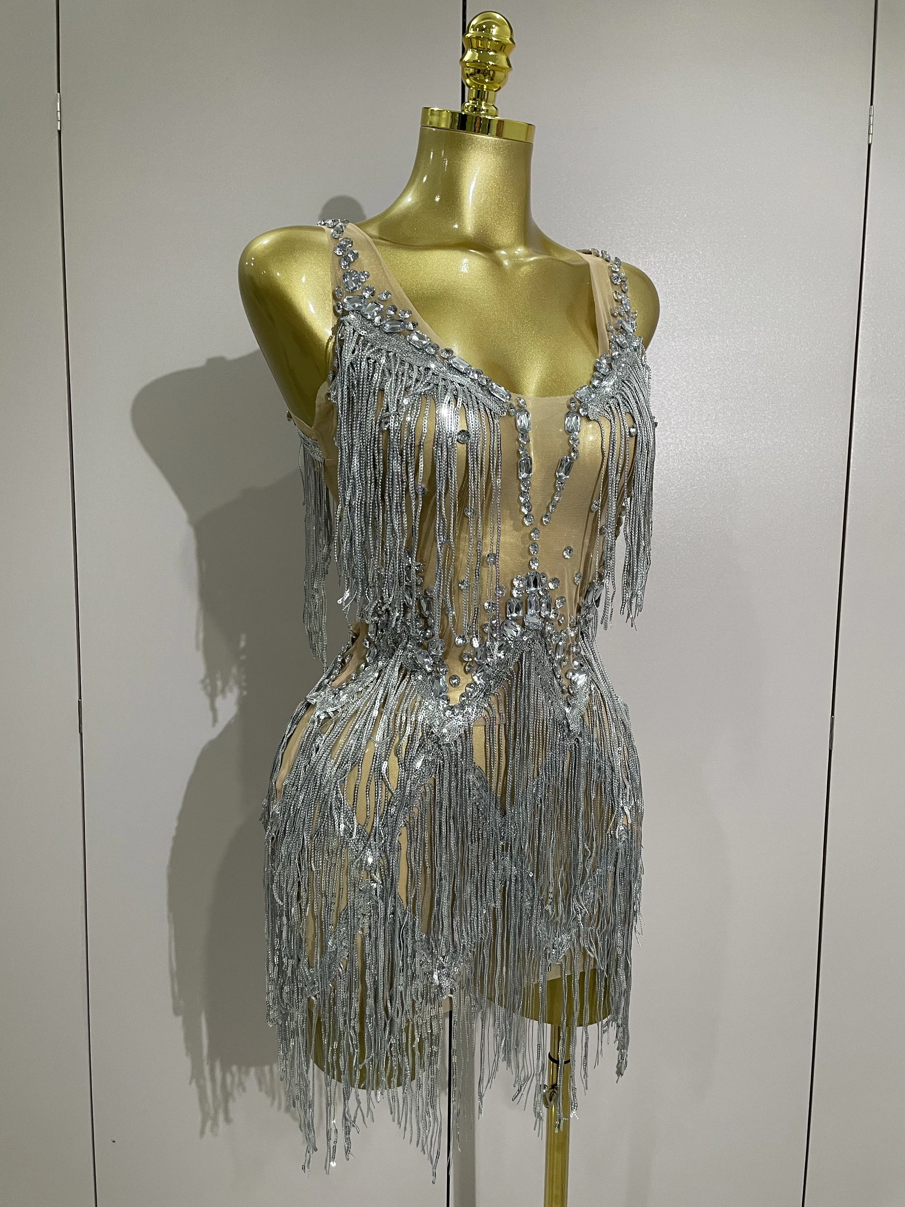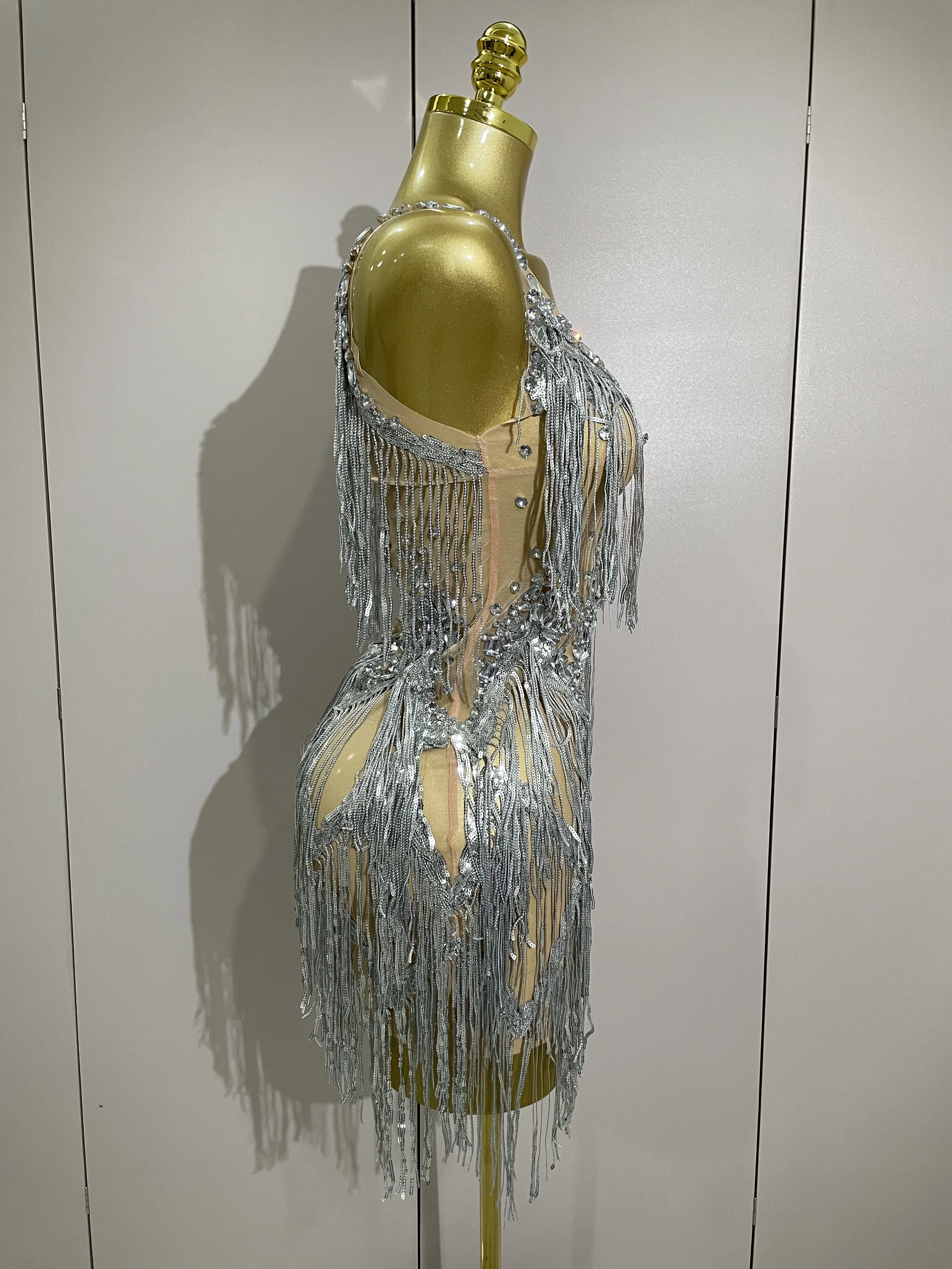 Sparkly Rhinestone Tassels Sexy Mesh Mini Dress 2025 Women Evening Birthday Part
