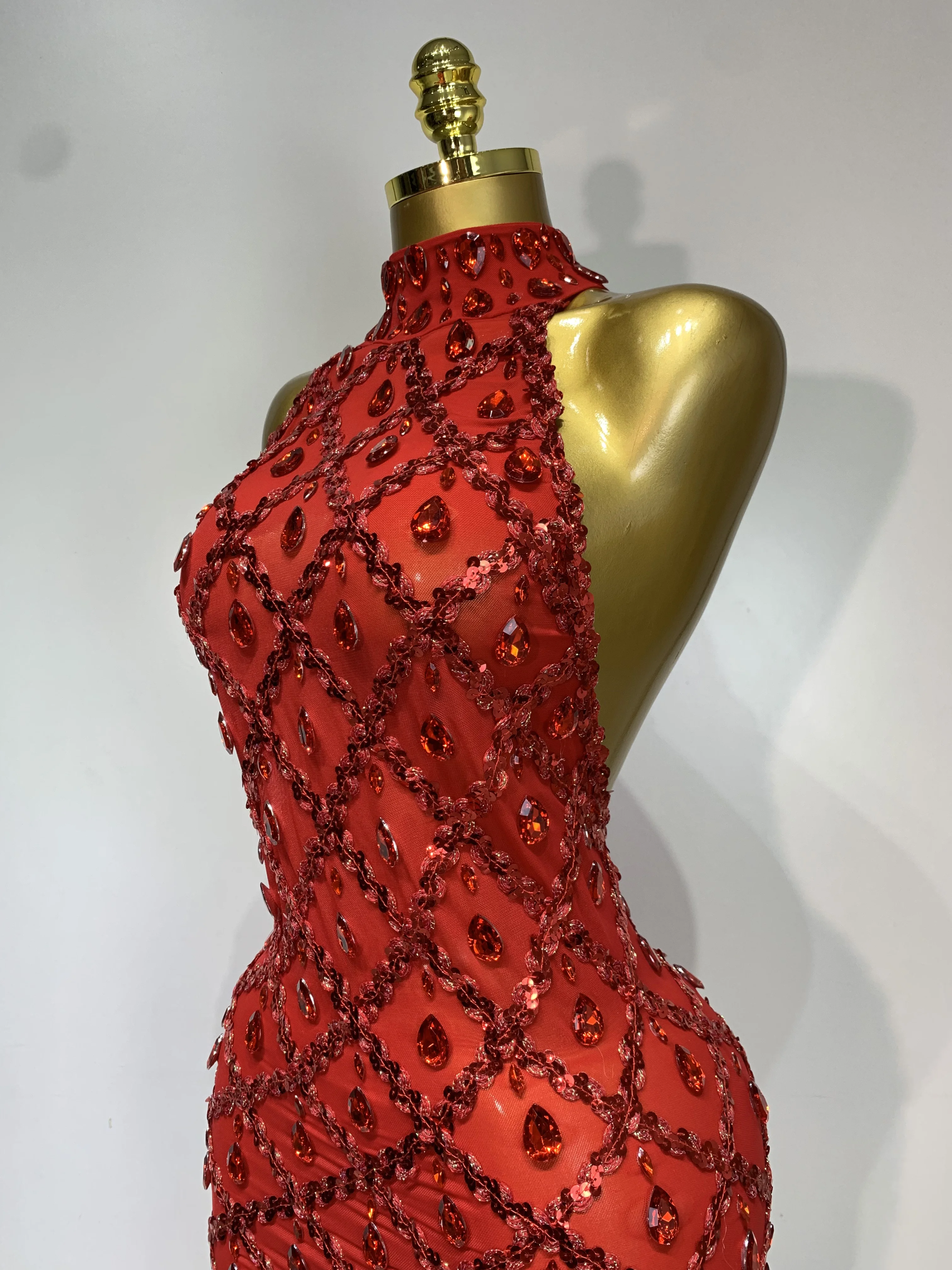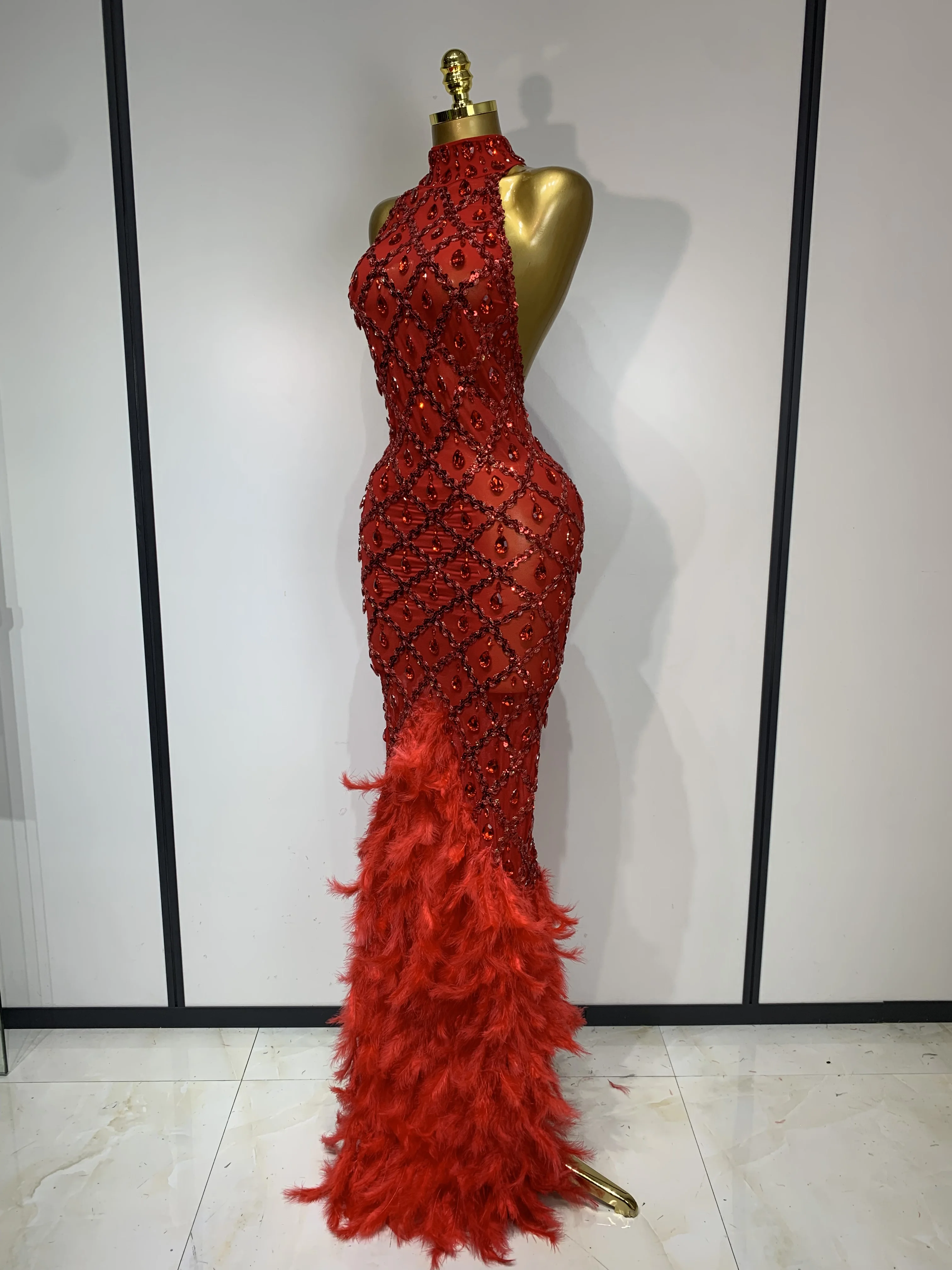 Sparkly Rhinestones Feather Sexy Mesh Long Dress Women Luxury Birthday Evening R