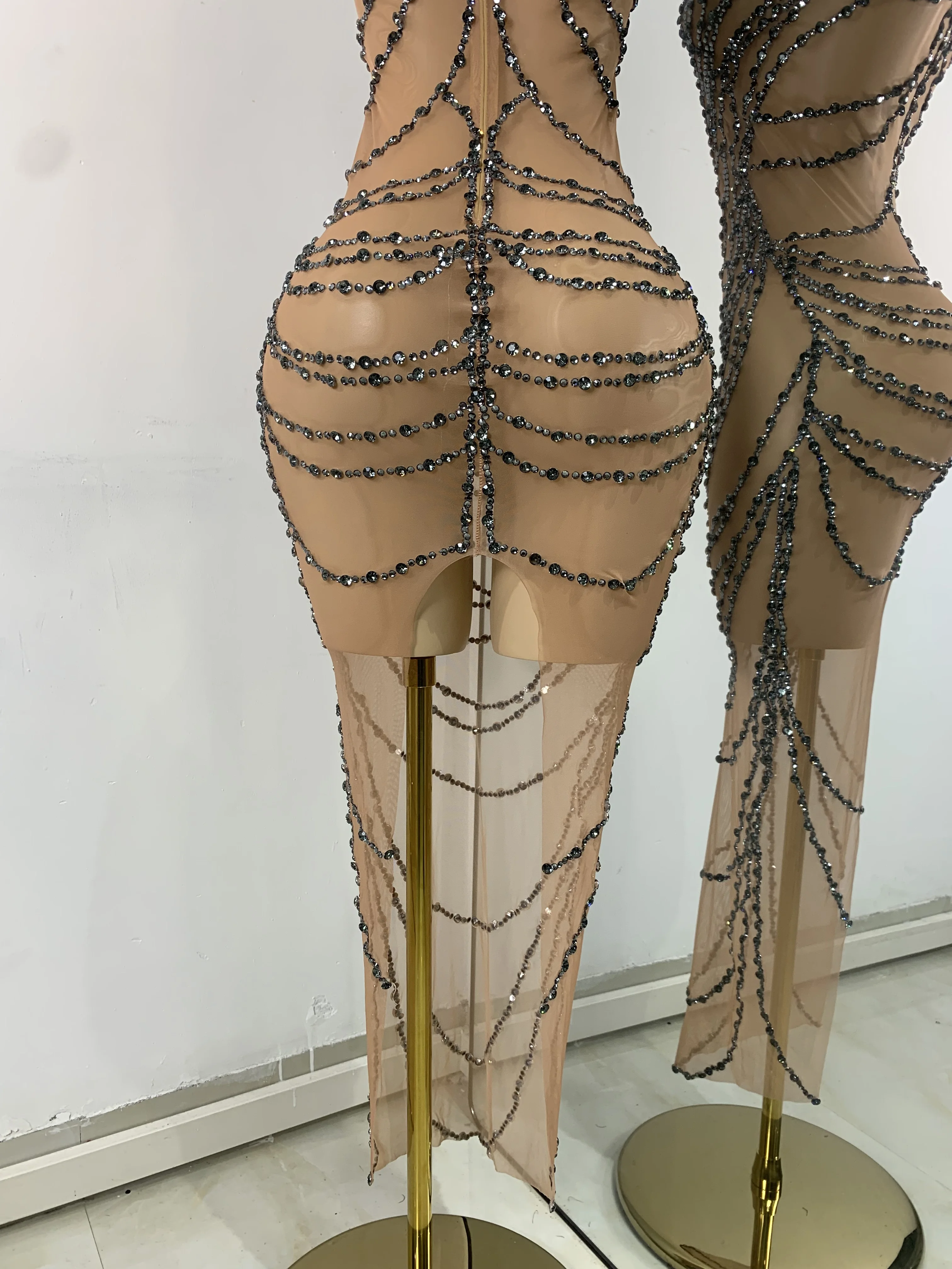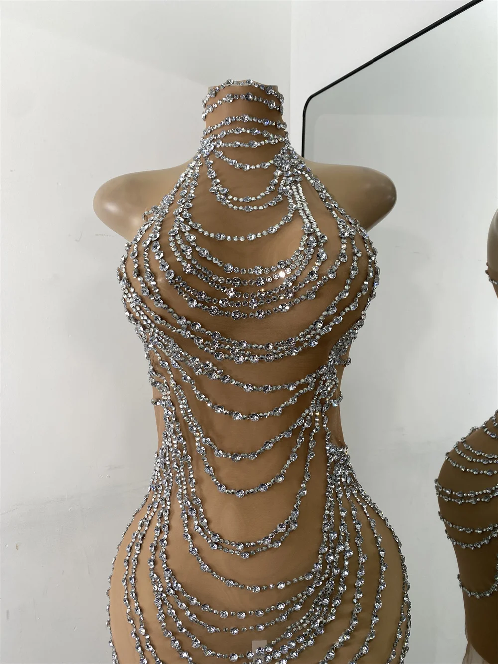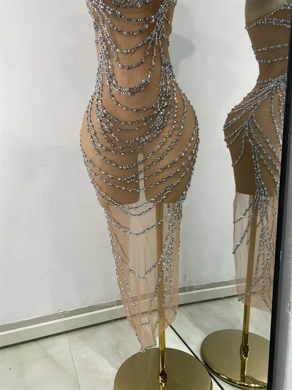 Sparkly Rhinestones Mesh See Through Maxi Dress Women Sexy Sleeveless Luxury Eve