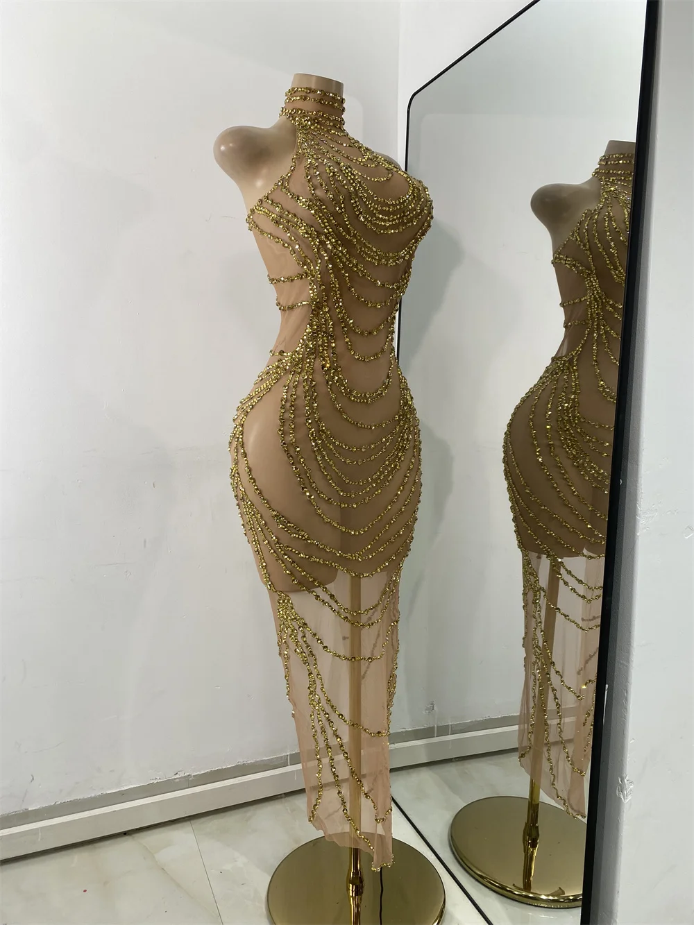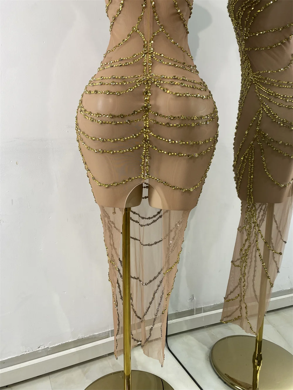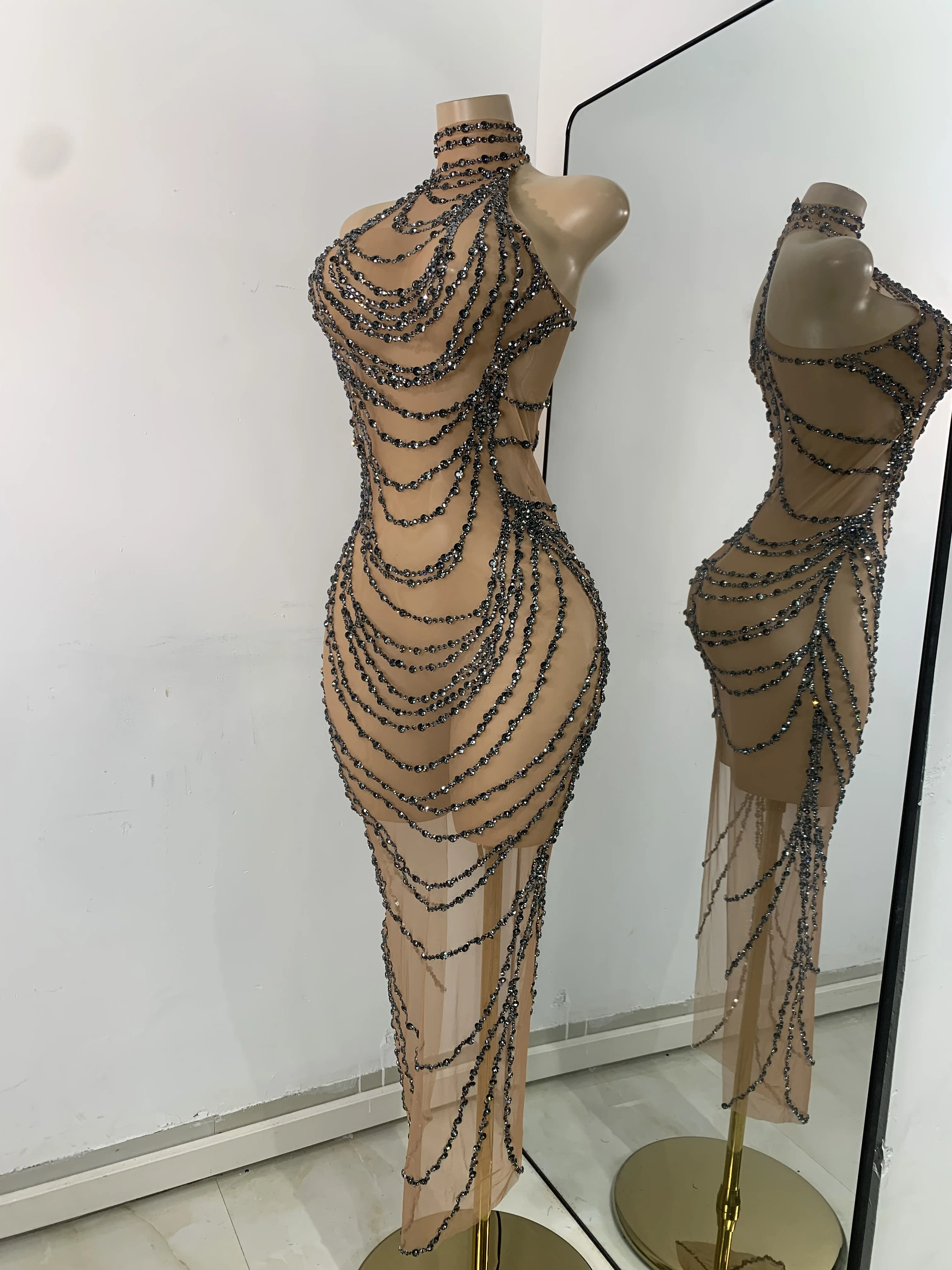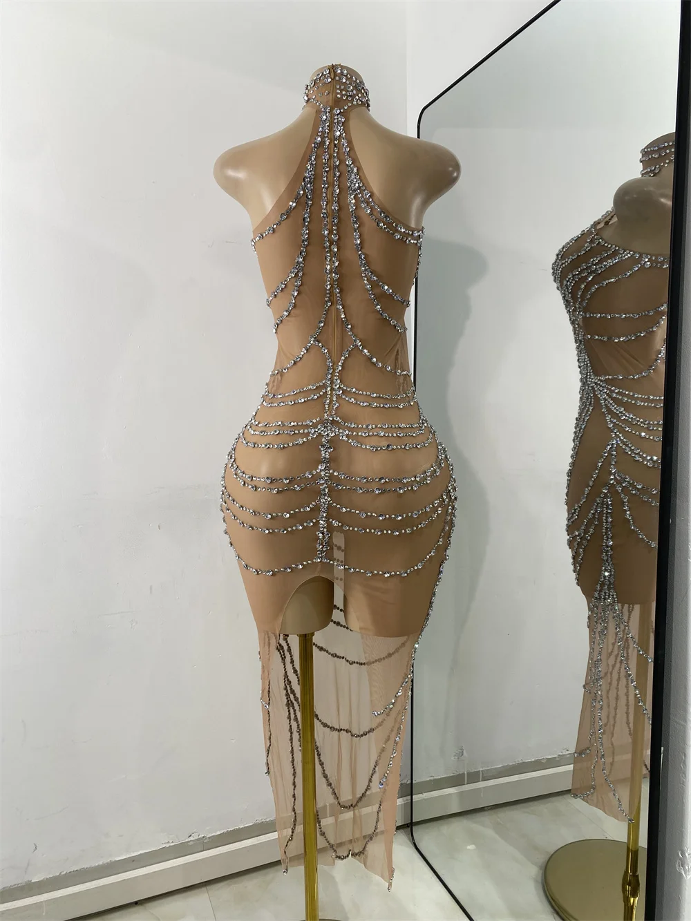 Sparkly Rhinestones Mesh See Through Maxi Dress Women Sexy Sleeveless Luxury Eve