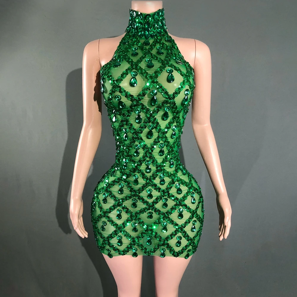 Sparkly Rhinestones Short Dress for Women Sexy Mesh Transparent Celebrate Evenin