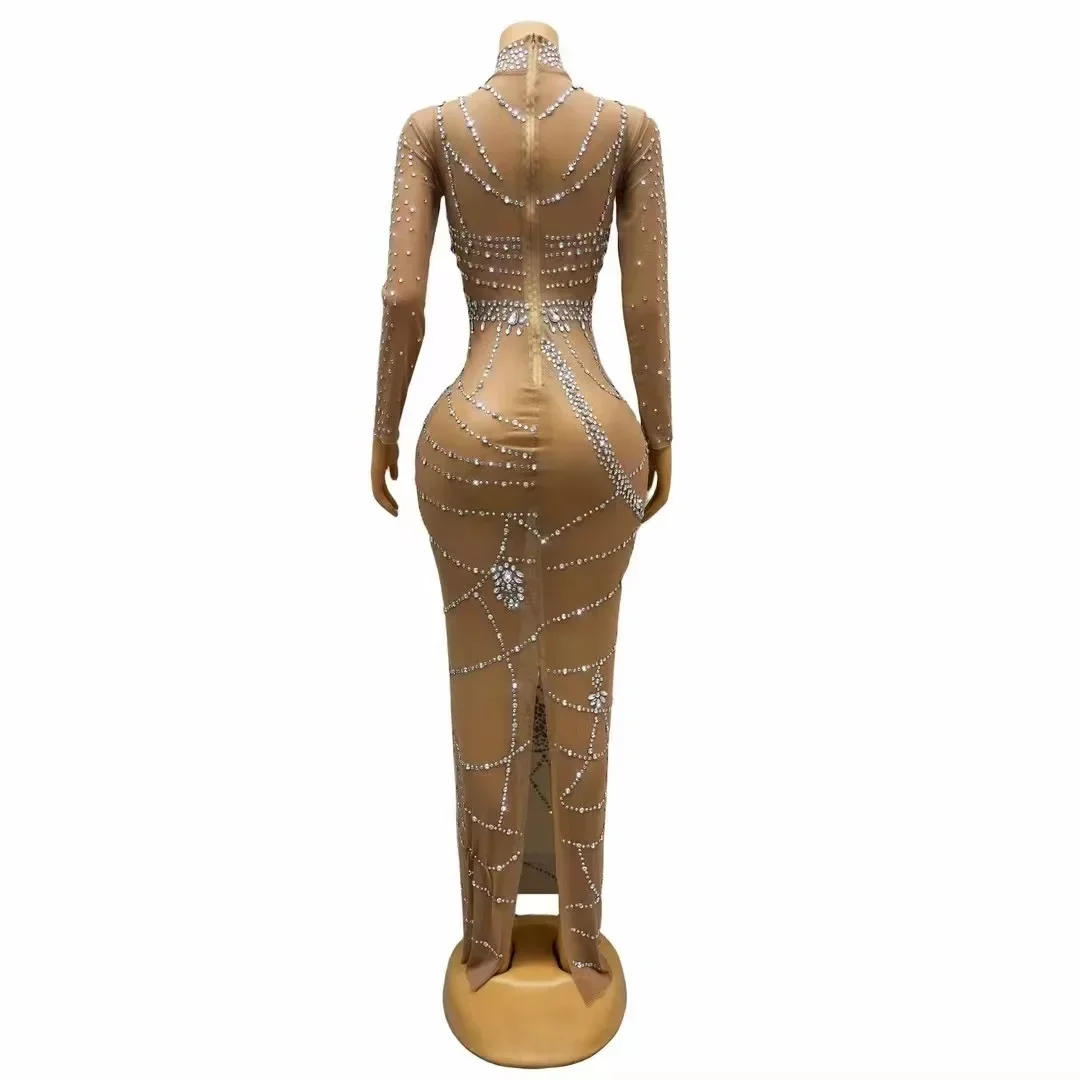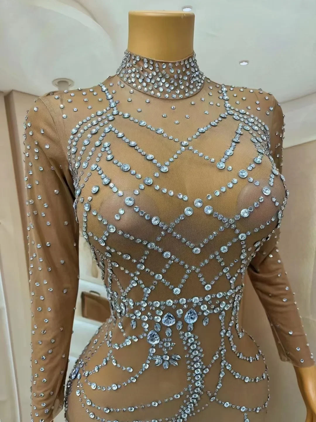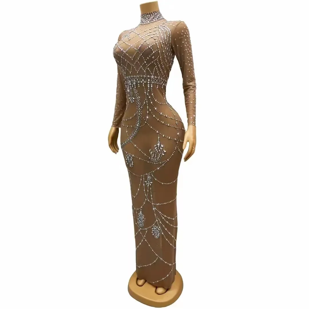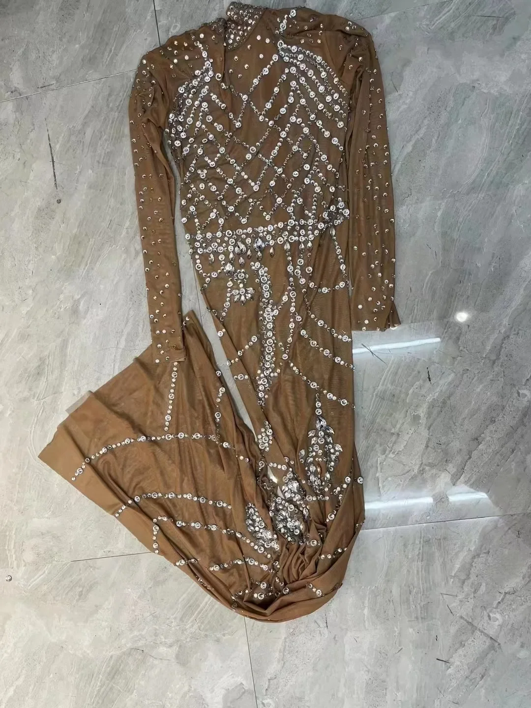 Sparkly Silver Rhinestones Long Sleeves Crystals Long Dress Mesh Birthday Celebr