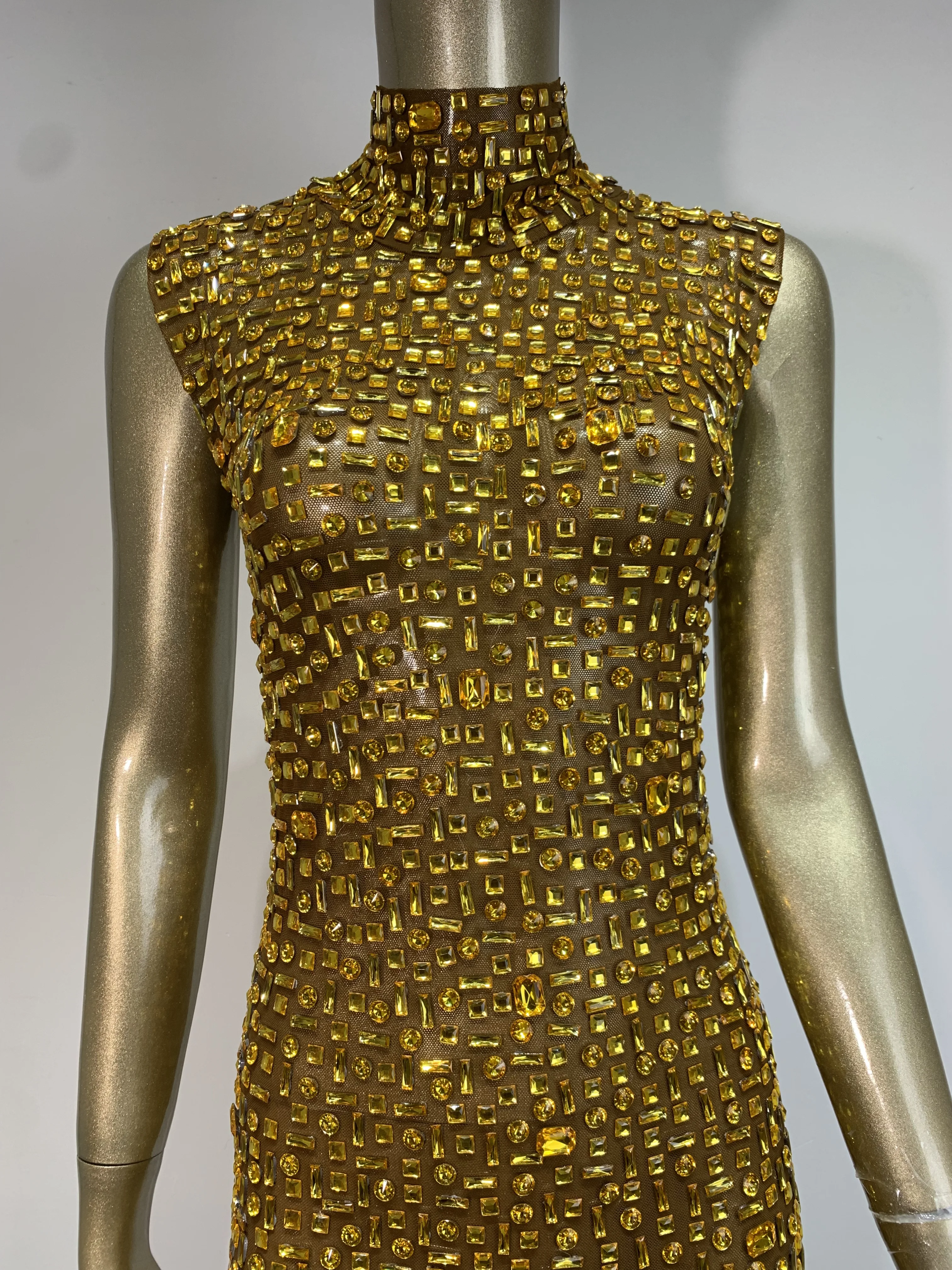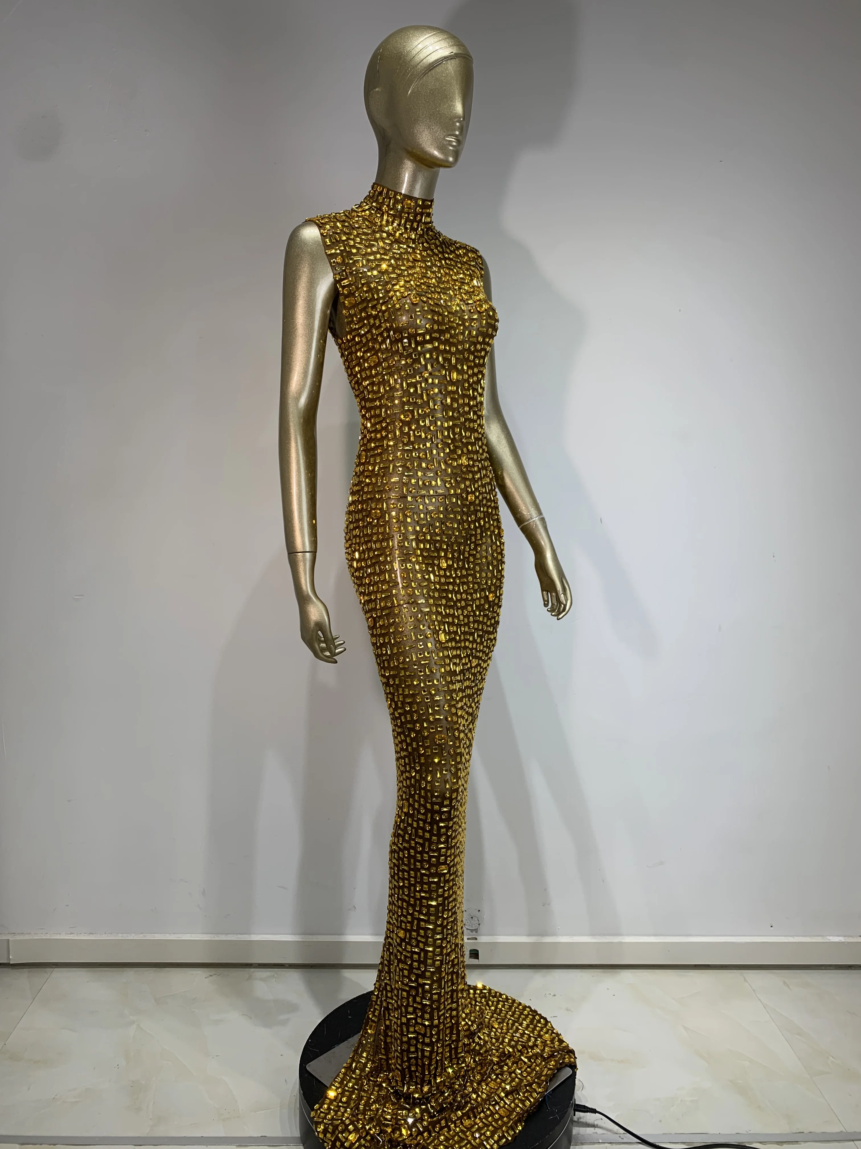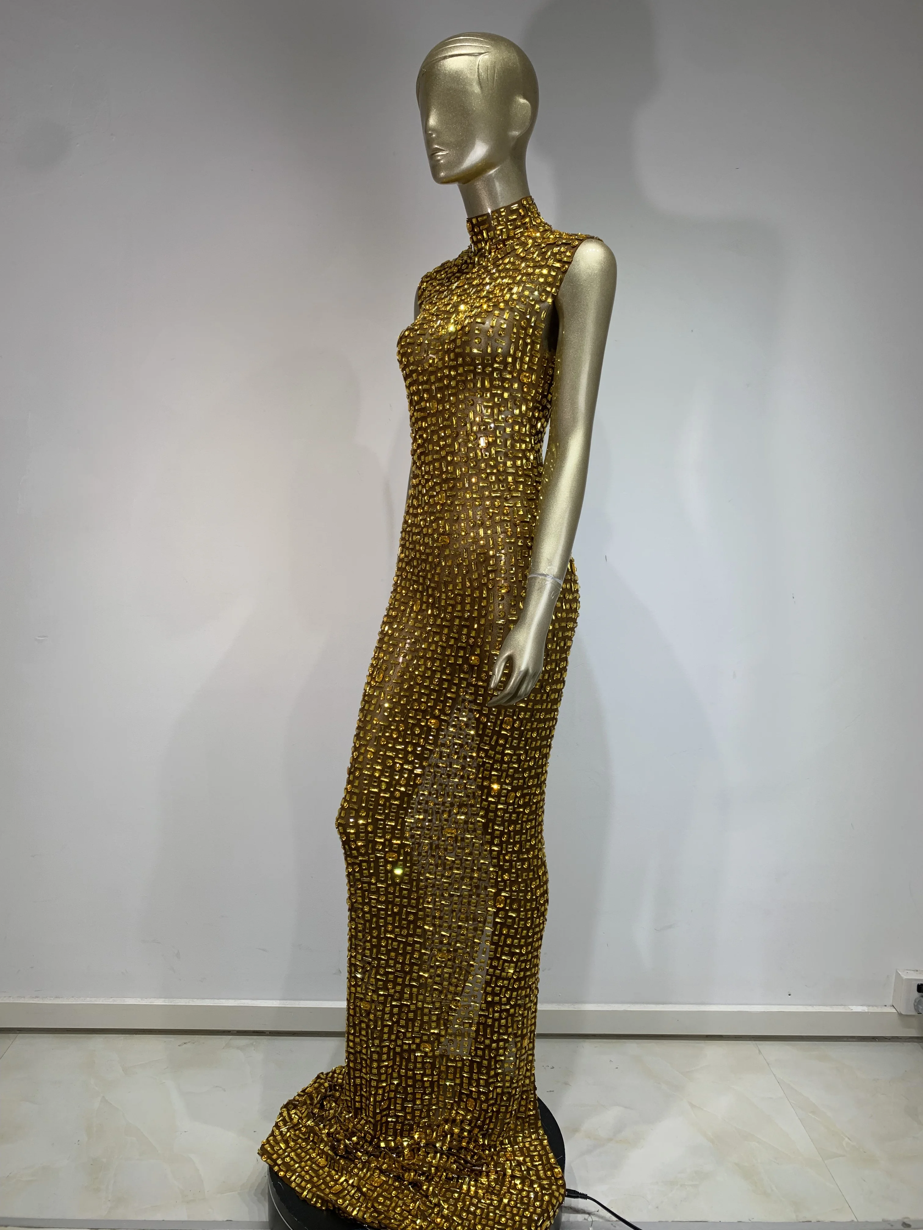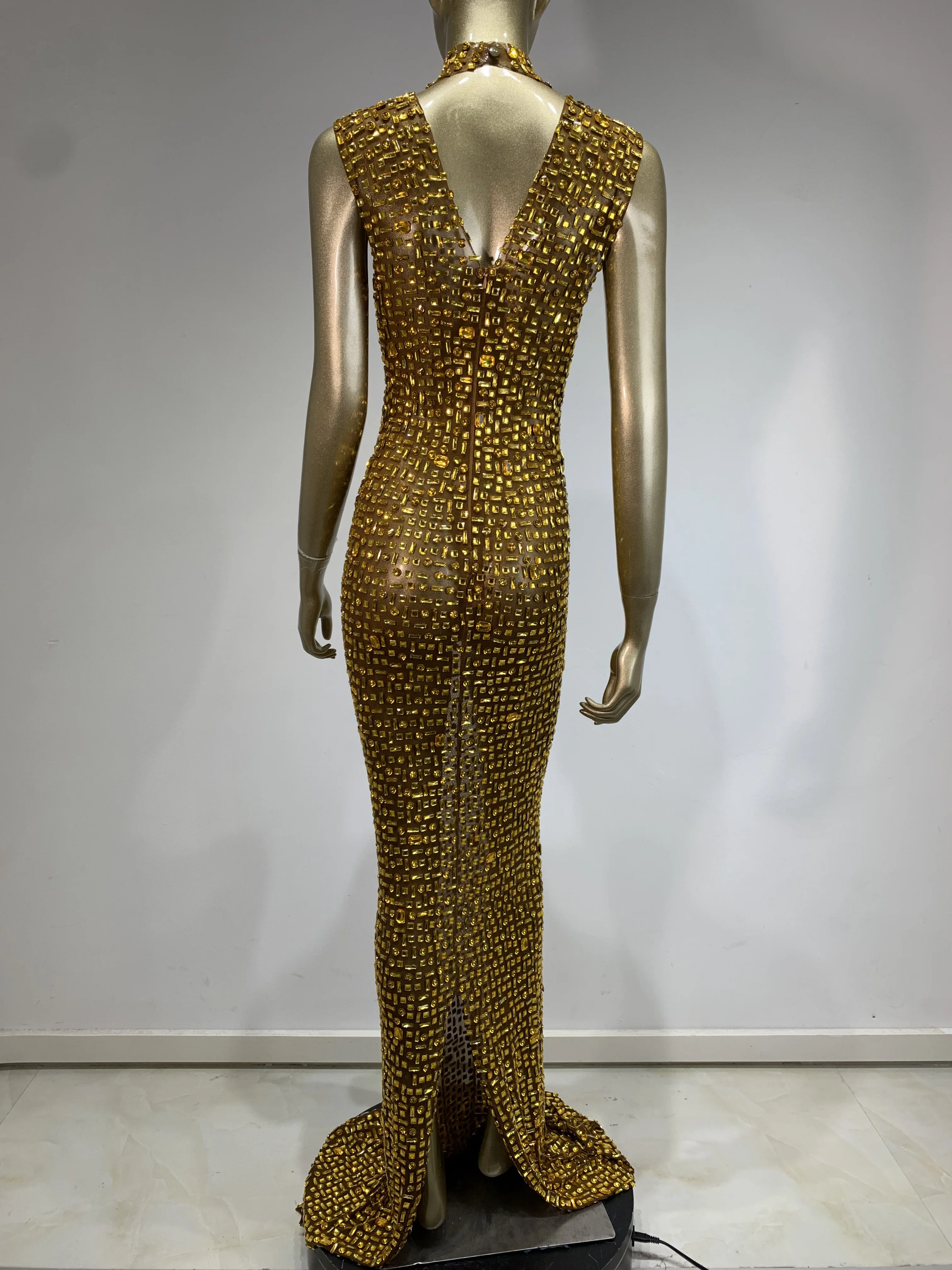 Women Luxury Gold Rhinestone Sexy Mesh Maxi Long Dress Sparkling Stage Costume E