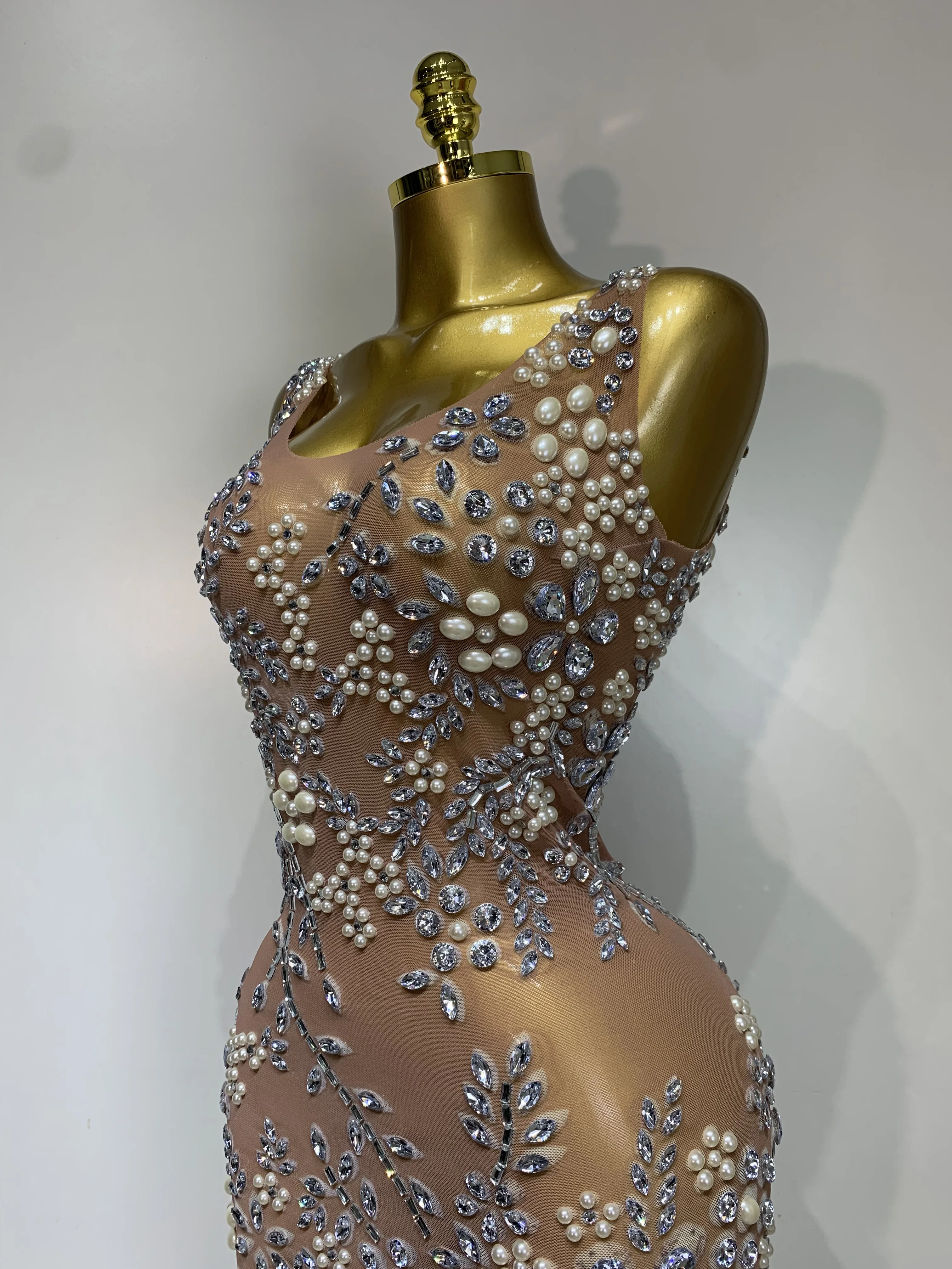 Women Lxury Diamonds Mesh See Through Long Dress Celebrity Elegant Evening Party