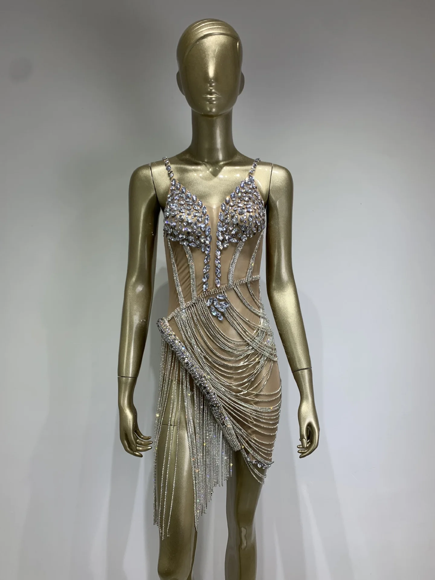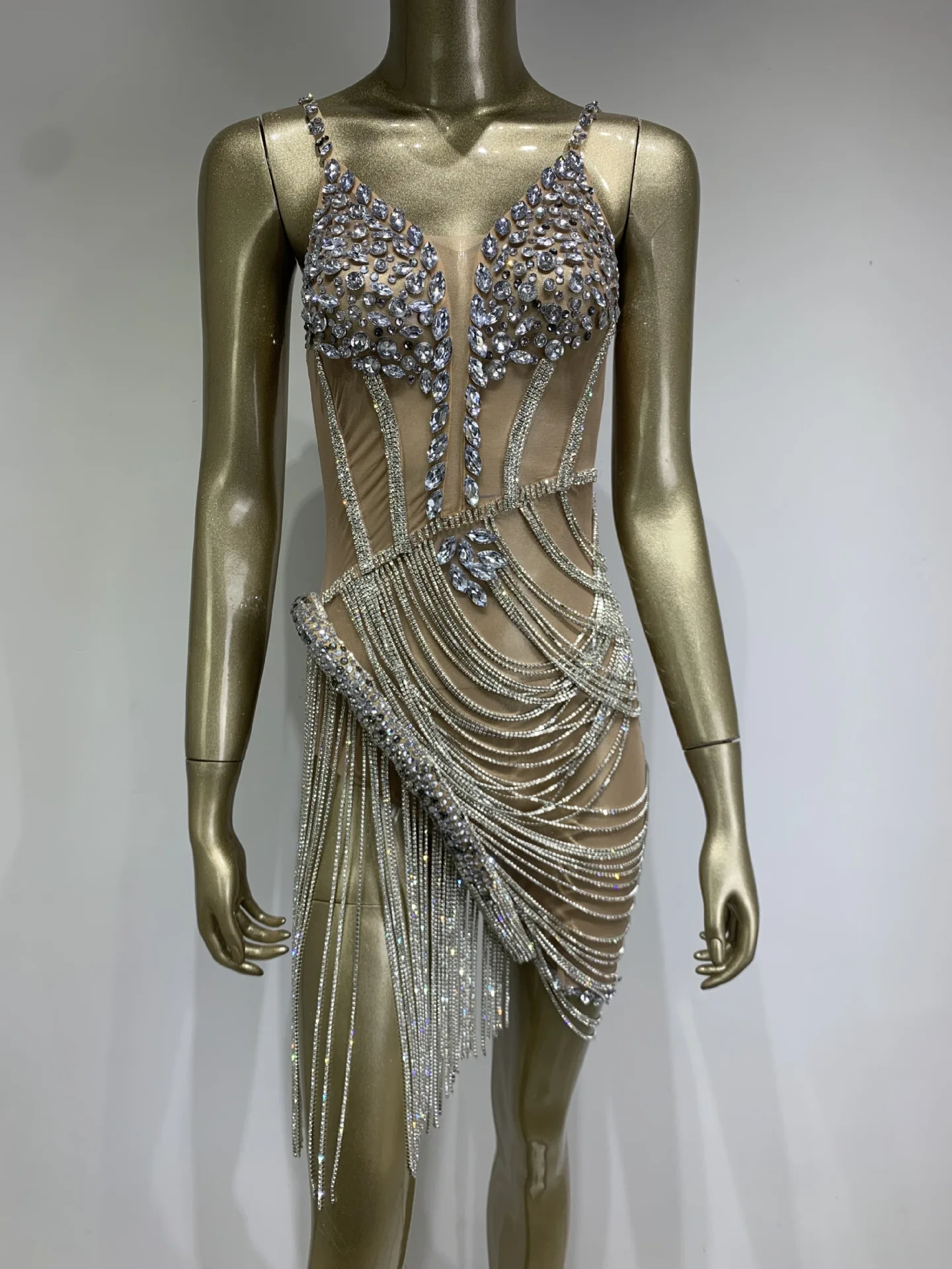 Women Sexy Strap V Neck Crystal Diamonds Mini Beige Mini Dress Birthday Party Co