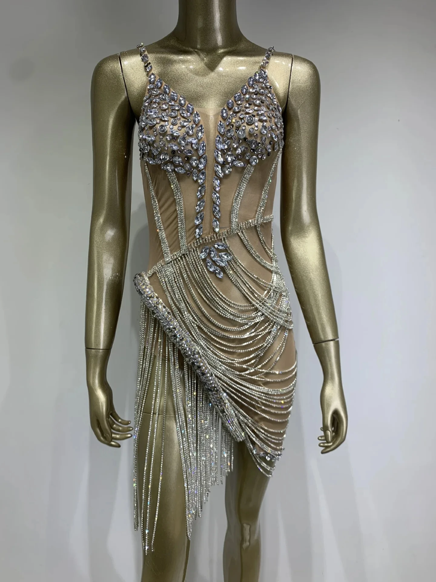 Women Sexy Strap V Neck Crystal Diamonds Mini Beige Mini Dress Birthday Party Co