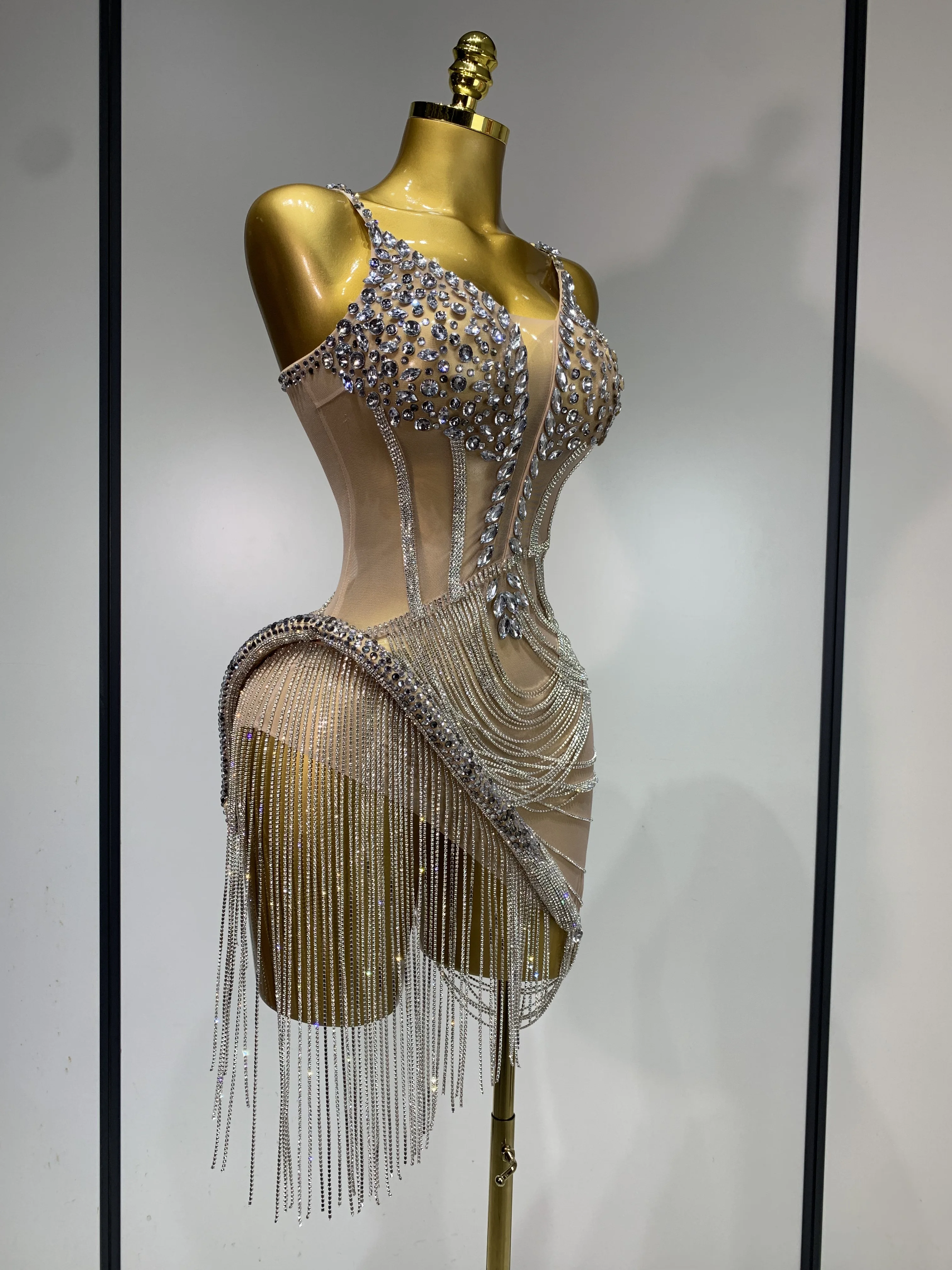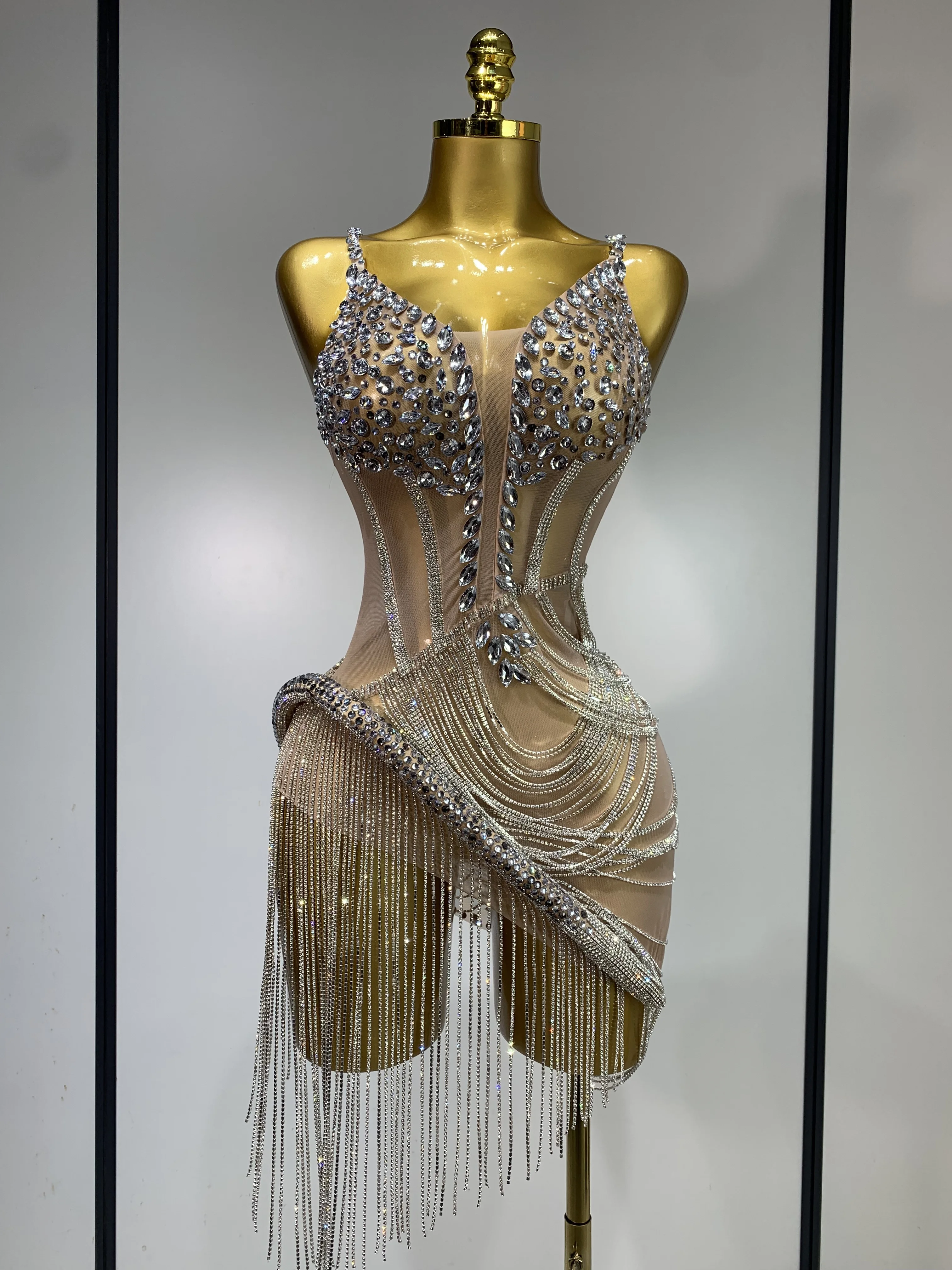 Women Sparkly Rhinestones Fringes Mesh See Through Short Dress Celebrate Birthda