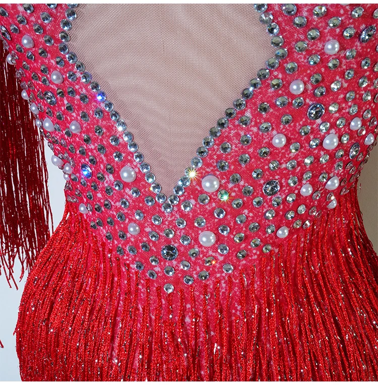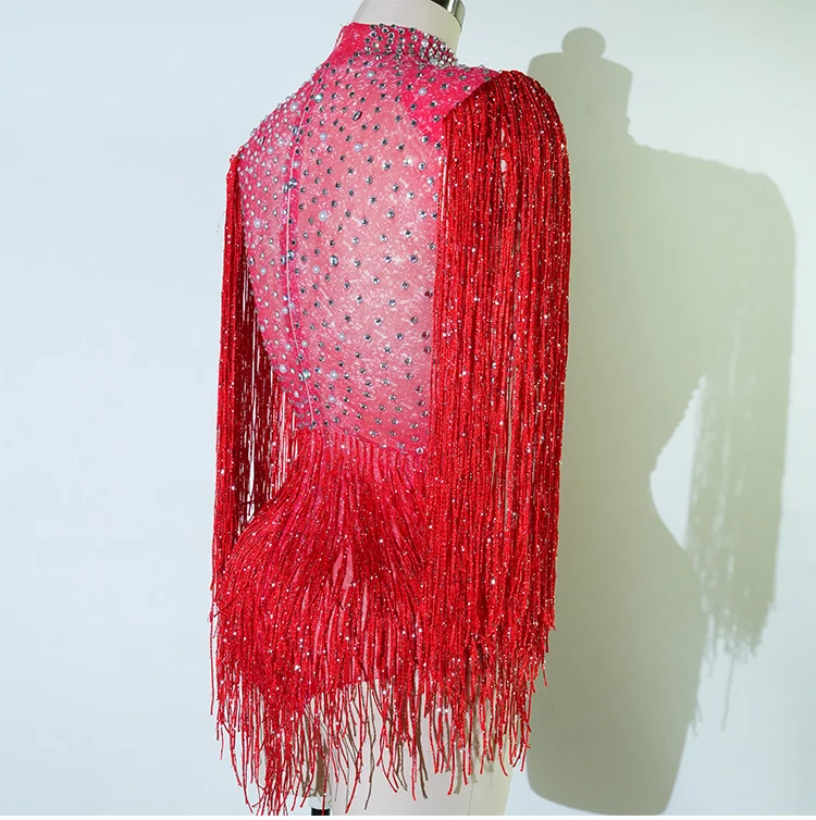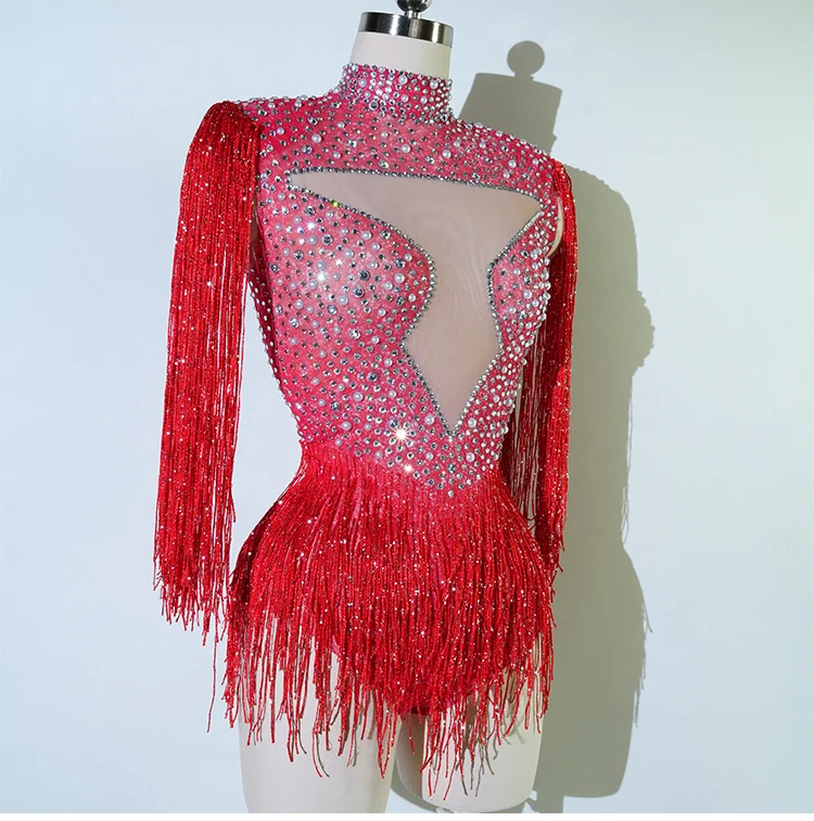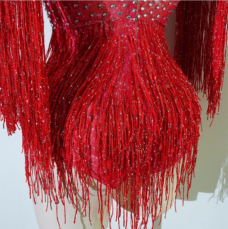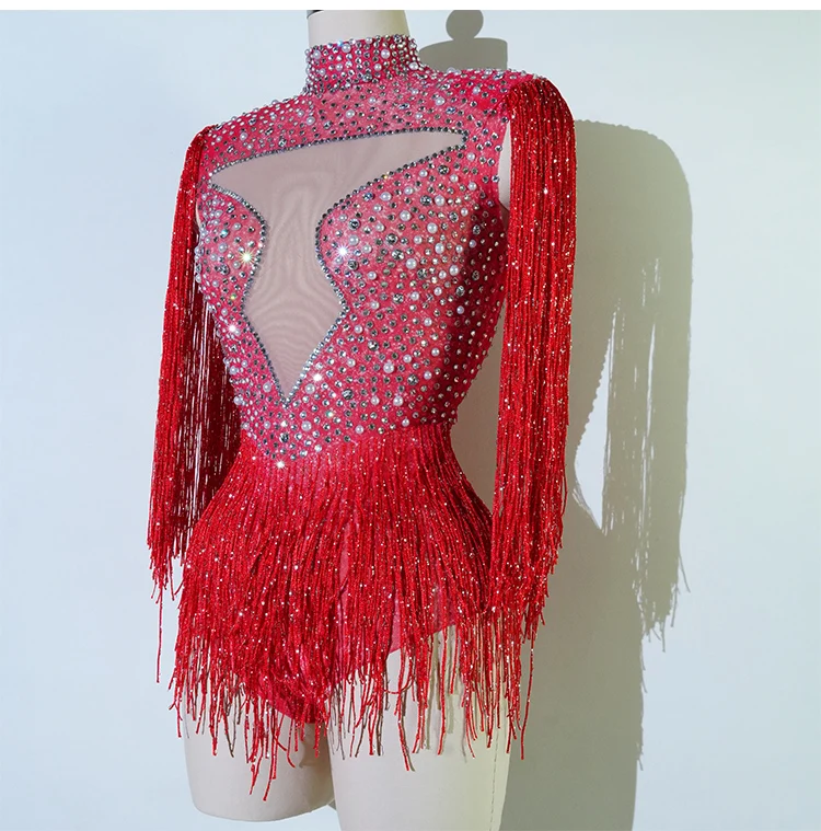 Women Sparkly Rhinstones RED Tassel Bodysuit High Street Strech Transparent Perf